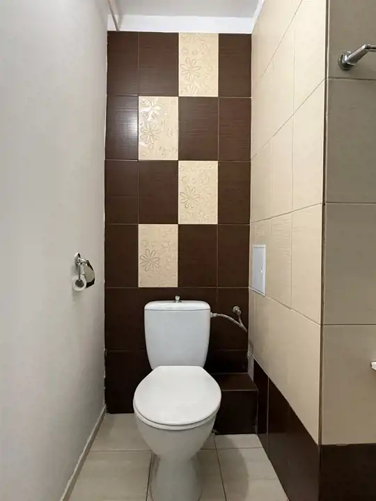 w łazience kompozycja płytek czekoladowo-beżowych, nowe drzwi.