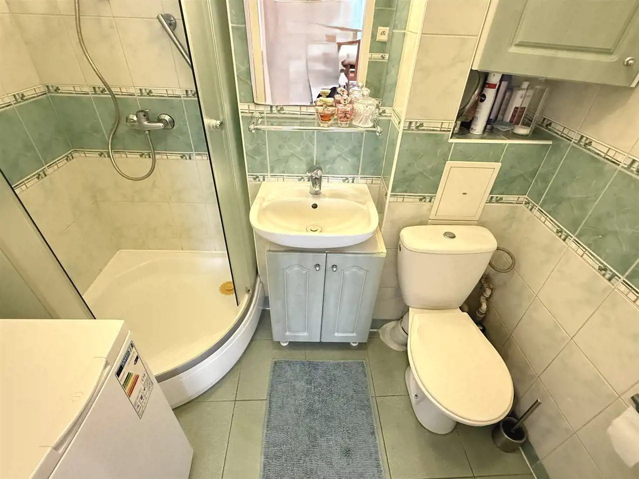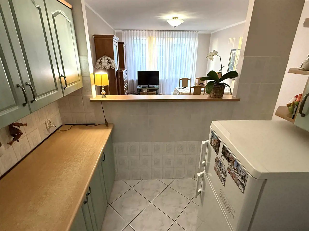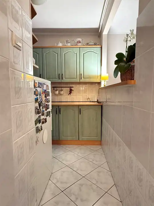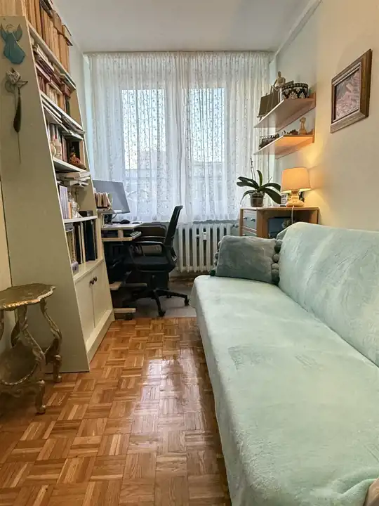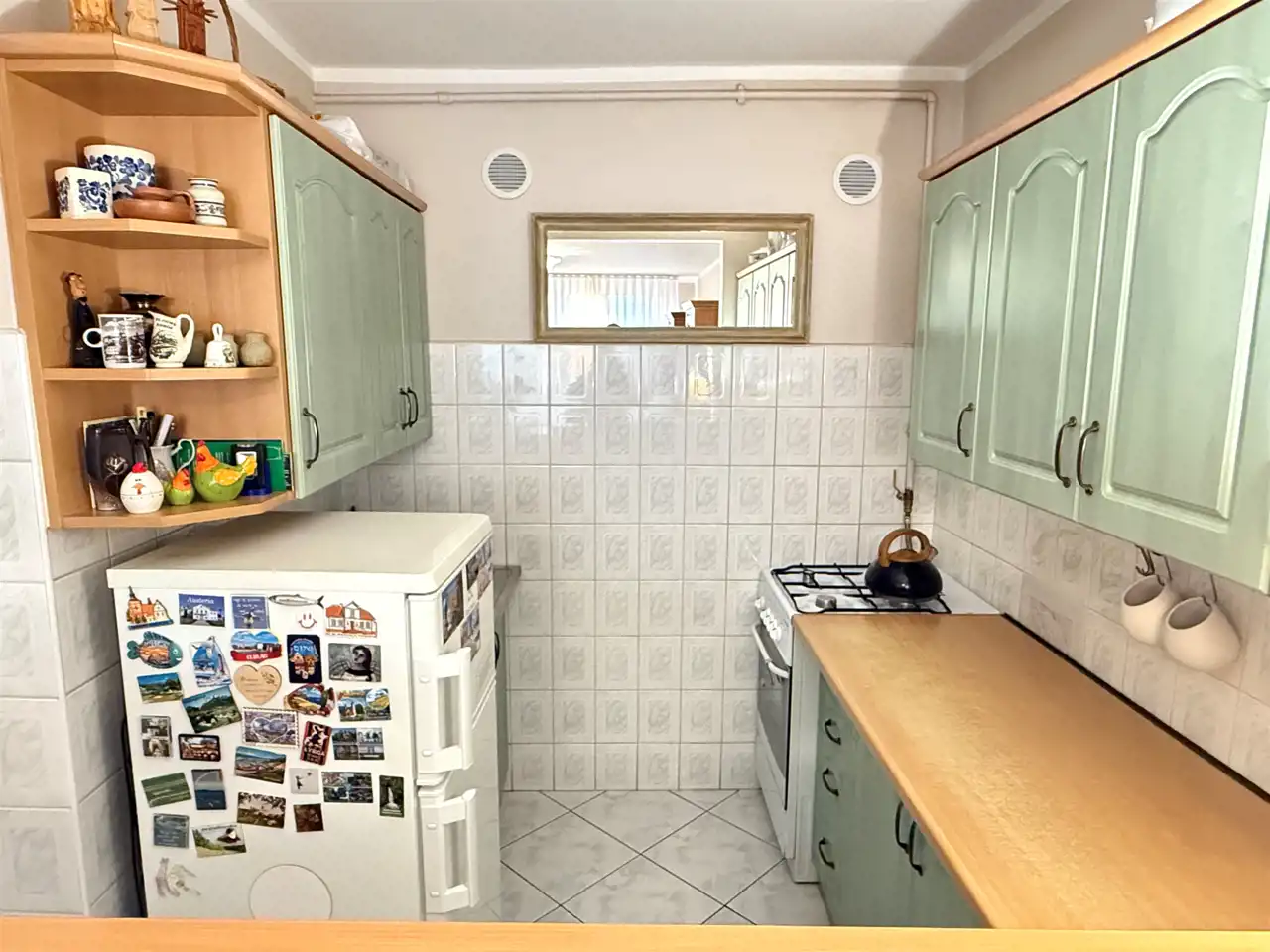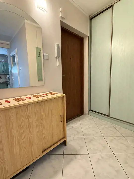 W pokojach na podłodze mozaika parkietowa, na ścianach i suficie gładź, okna PCW, z roletami materiałowymi, w łazience, kojarząca się z wodami mórz południowych, zielono-seledynowa glazura i terakota, w kuchni także płytki, w cenie pozostają meble kuchenne, szafa z drzwiami przesuwnymi w przedpokoju.