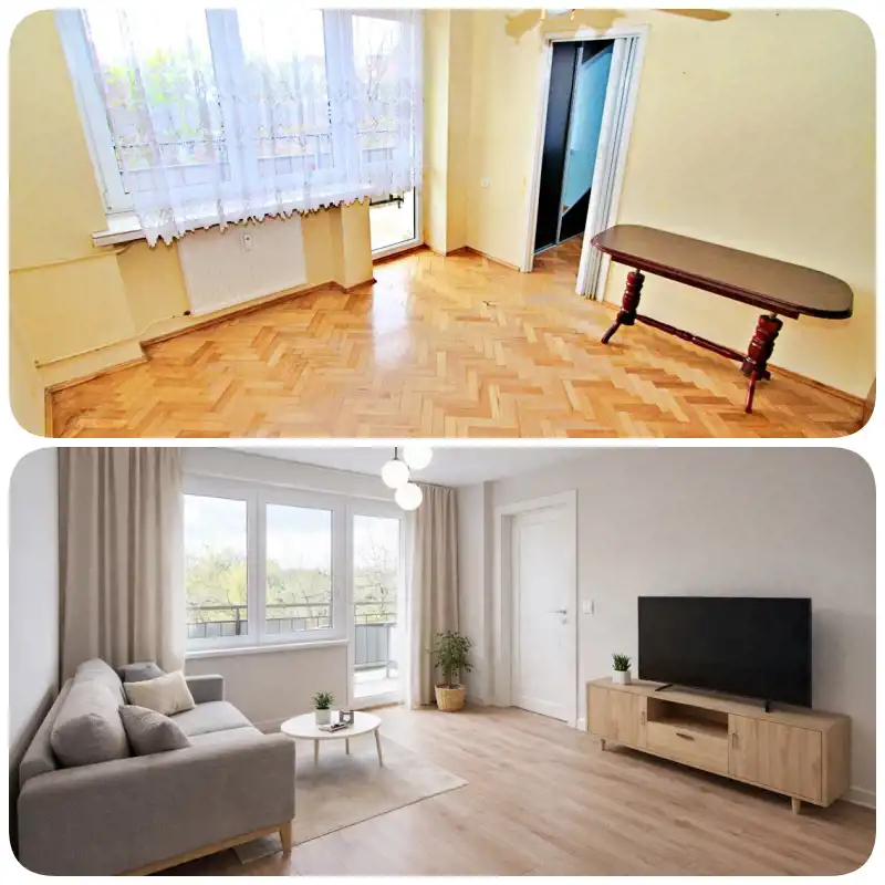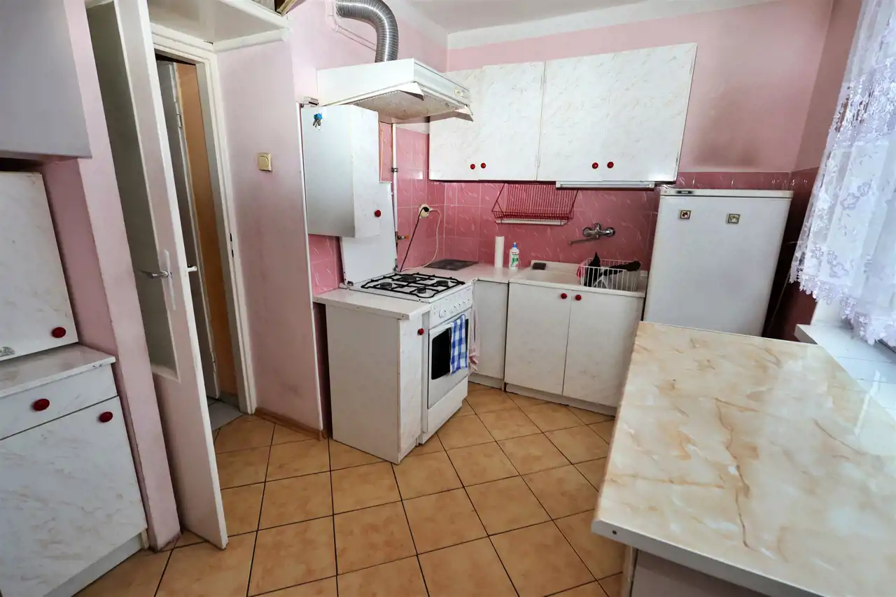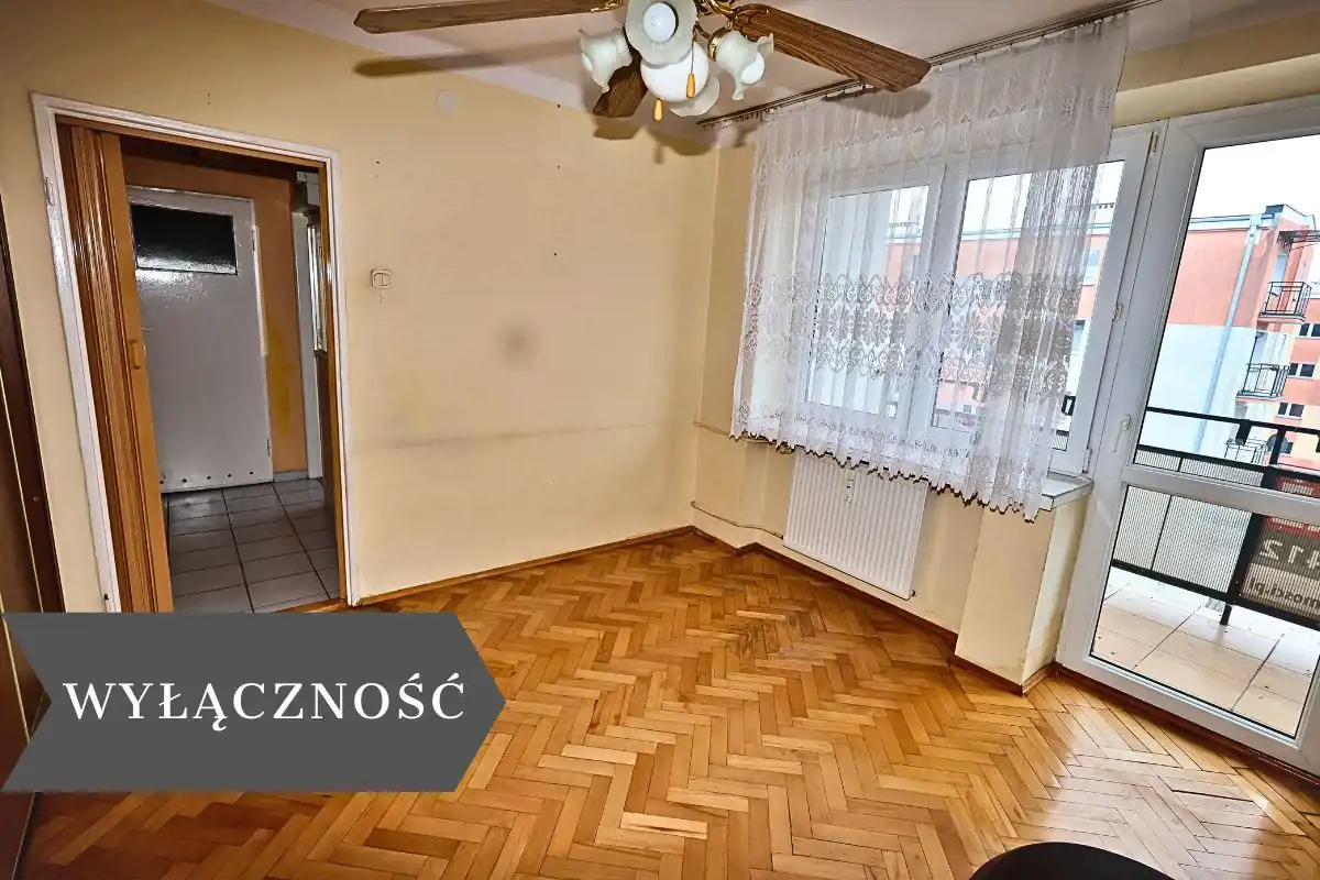 Wnętrze zostało zaplanowane z myślą o komforcie mieszkańców. Dwa dobrze doświetlone pokoje można wygodnie zaaranżować jako salon i sypialnię, tworząc przestrzeń do odpoczynku i codziennych spotkań. W mieszkaniu znajduje się także osobna kuchnia, która – podobnie jak pozostałe pomieszczenia – wymaga odświeżenia, co daje szansę przyszłemu właścicielowi na personalizację wnętrza zgodnie z własnym stylem. Okna PCV zapewniają dobrą izolację akustyczną i termiczną, dzięki czemu mieszkanie jest ciche i przytulne.