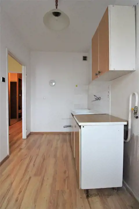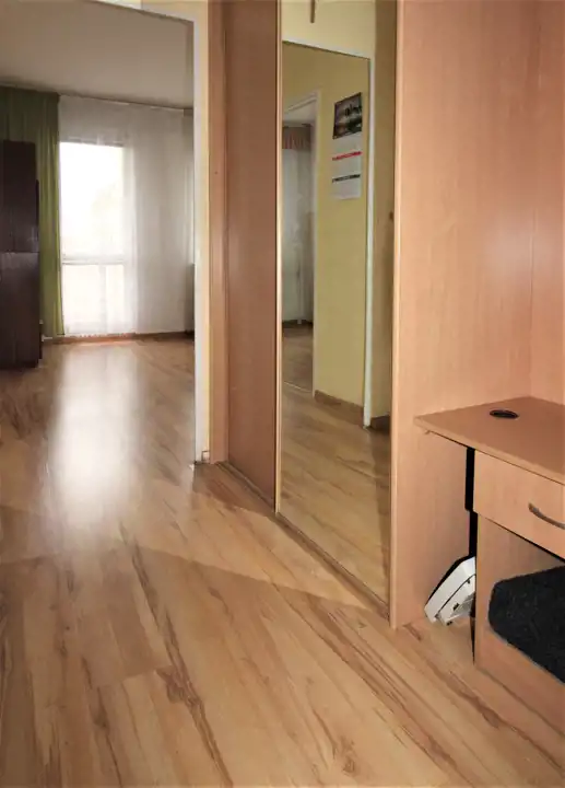 Na podłogach w pokoju, korytarzu i kuchni panele.