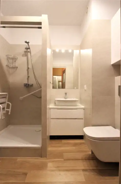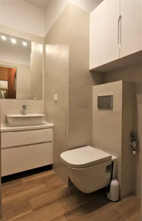 -eleganckiej, wyremontowanej, funkcjonalnej łazienki z kabiną prysznicową, umywalką, zabudową meblową, miejscem na pralkę, lustrem i toaletą.