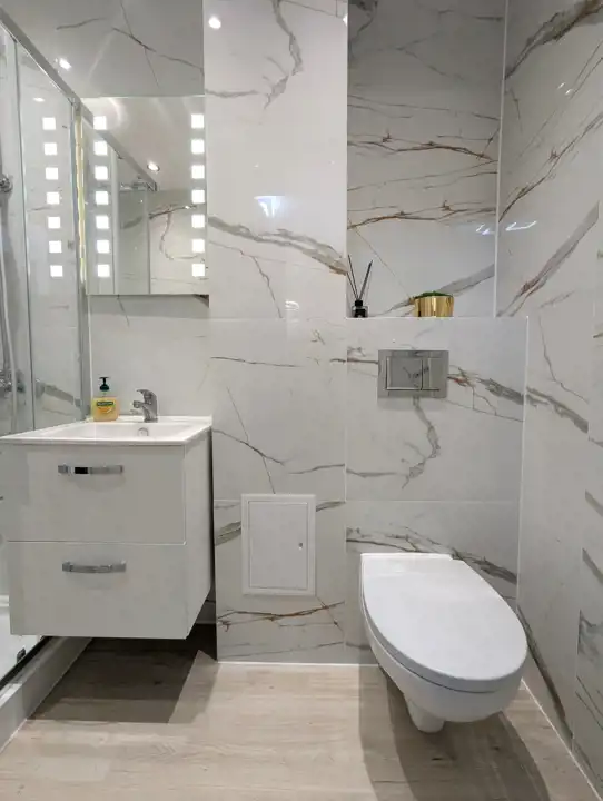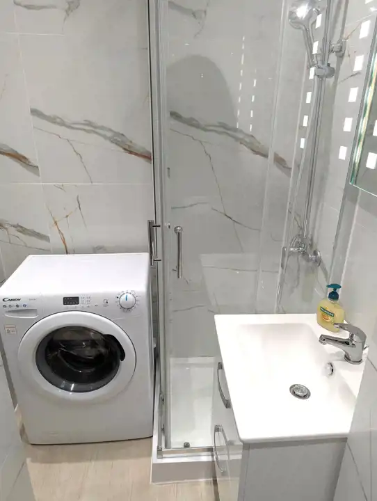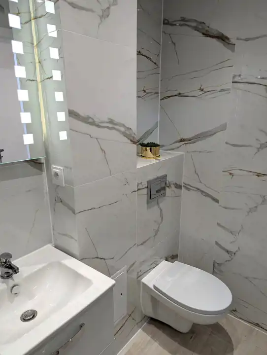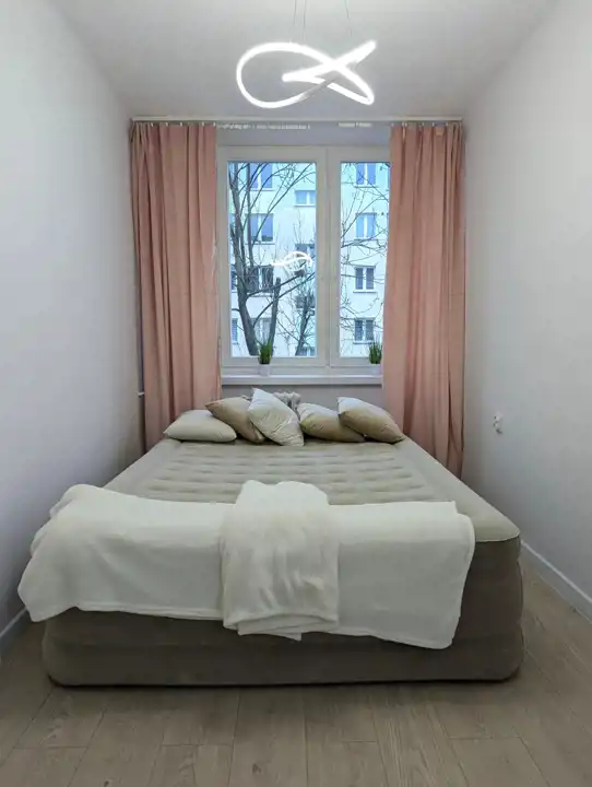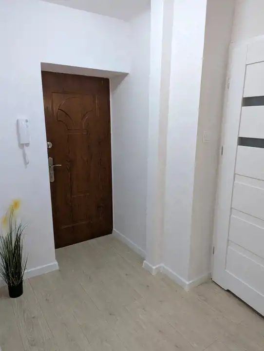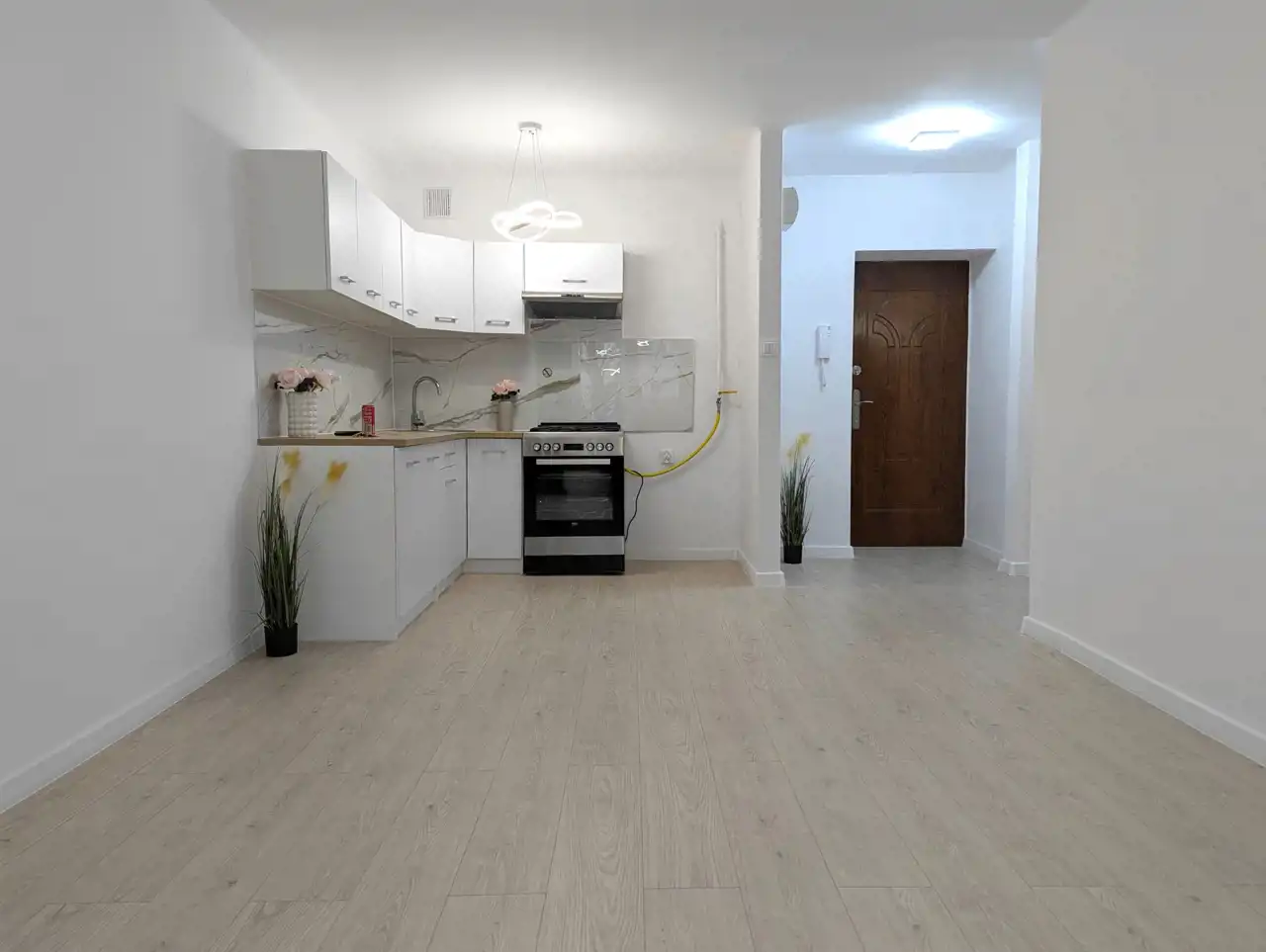 Pokój z aneksem kuchennym o powierzchni 20,76 mkw, sypialnia - 9,68 mkw, łazienka z WC – 2,60 mkw, przedpokój. W pokojach na podłodze jasne panele, położone na wylewce samopoziomującej, na ścianach i suficie nieskazitelnie biała gładź, w aneksie kuchennym meble z białymi frontami, biała glazura a`la marmur, łazienka także w białych płytkach, z nowoczesnymi urządzeniami sanitarnymi, umywalką z szafką, muszlą wiszącą, kabiną prysznicową, pralką, białe drzwi wewnętrzne, oryginalne oświetlenie, nowa instalacja elektryczna, białe, ekologiczne okna drewniane.