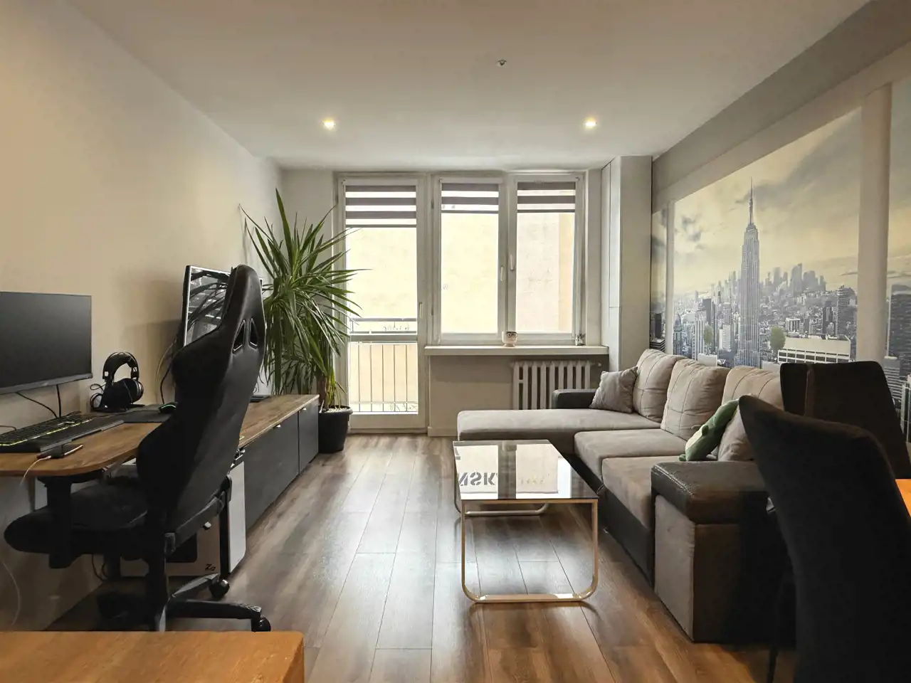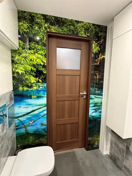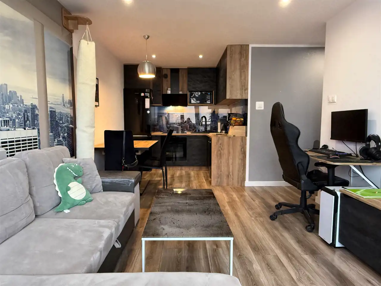 Już sam salon z aneksem kuchennym o łącznej powierzchni 20,26 m², pośrodku jadalnia - stół z krzesłami, wygodna kanapa – robi wrażenie poprzez umieszczenie na jednej ze ścian, optycznie powiększającej przestrzeń, pięknej fototapety z panoramą dużego miasta. W aneksie kuchennym, na ścianach między szafkami dolnymi i górnymi a także na jednej ze ścian łazienki, podobne jak w salonie, kolorowe obrazy zatopione w szkle (lacobel).