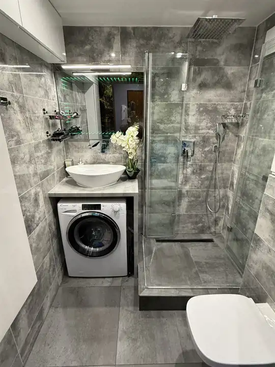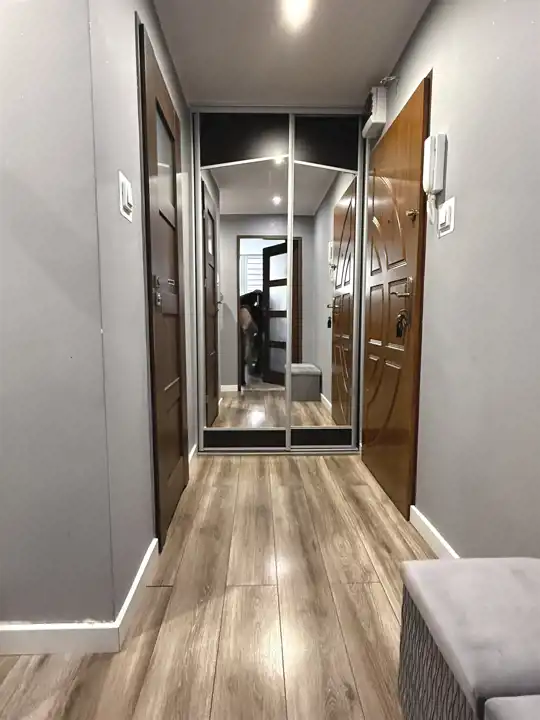 W salonie, w sypialni (8,66 mkw), w przedpokoju i aneksie kuchennym na podłodze panele, na ścianach i sufitach gładź, sufity podwieszane. Łazienka (2,88 mkw) cała w szarym gresie, z kontrastującymi, białymi, nowoczesnymi urządzeniami sanitarnym – muszlą wiszącą, szklaną kabiną prysznicową, umywalką, pralką, białymi szafkami łazienkowymi. W aneksie kuchennym zabudowa meblowa z wkomponowanym sprzętem: płytą indukcyjną, piekarnikiem, pochłaniaczem zapachów, zmywarką, lodówką. W cenie pozostają szafy z drzwiami przesuwnymi w przedpokoju i w sypialni oraz inne meble, rolety w oknach, efektowne oświetlenie.
