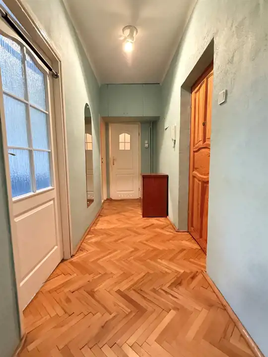 Pokój dzienny o powierzchni 18,72 mkw, sypialnia - 11,56 mkw, jasna kuchnia - 8,67 mkw, łazienka z WC – 2,99 mkw, przedpokój – ponad 6 mkw. Okna PCW z roletami antywłamaniowymi, wymienione drzwi i ościeżnice, w pokojach i w przedpokoju na podłodze parkiet, na ścianach tynk malowany, w łazience glazura, terakota, w kuchni również płytki na podłodze i na ścianach, nowy grzejnik CO.