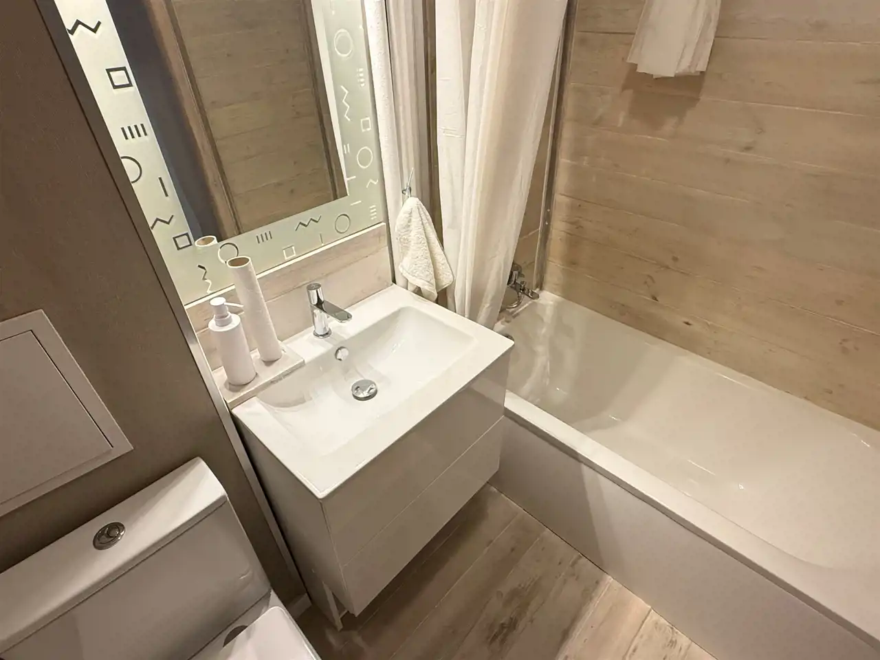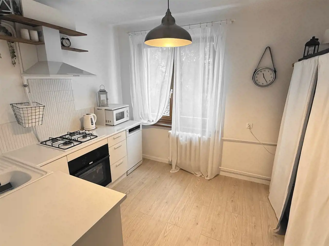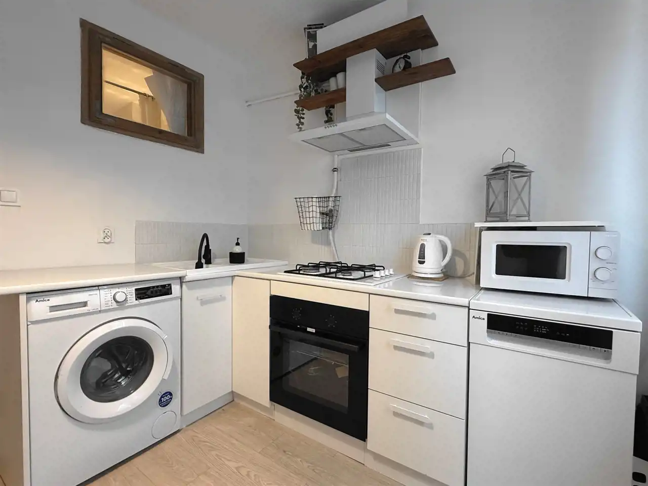 Całkowicie odnowione ! Nowa instalacja elektryczna wraz z rozdzielnicą, instalacja wodna, w pokojach, w przedpokoju i w kuchni na podłodze jasne panele, na ścianach i sufitach biała gładź, białe listwy przypodłogowe, białe meble kuchenne z wbudowanym sprzętem AGD – pralką Amica, płytą gazową, piekarnikiem elektrycznym, wyciągiem, zmywarką Amica, kuchenką mikrofalową – nad szafkami drobne, białe lamele, ekologiczne okna drewniane. W łazience z WC, na wzór skandynawski, niczym w saunie, ściany i podłoga wyłożone ciepłym i relaksującym drewnem, zabezpieczonym specjalistycznymi preparatami przed wilgocią, śnieżnobiałe urządzenia sanitarne, artystycznie opracowane i oświetlone lustro nad umywalką.