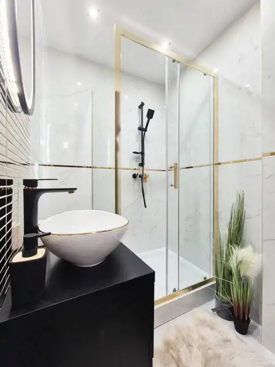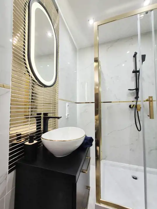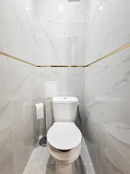 Łazienka i WC po remoncie, wykończona w nowoczesnym stylu.
