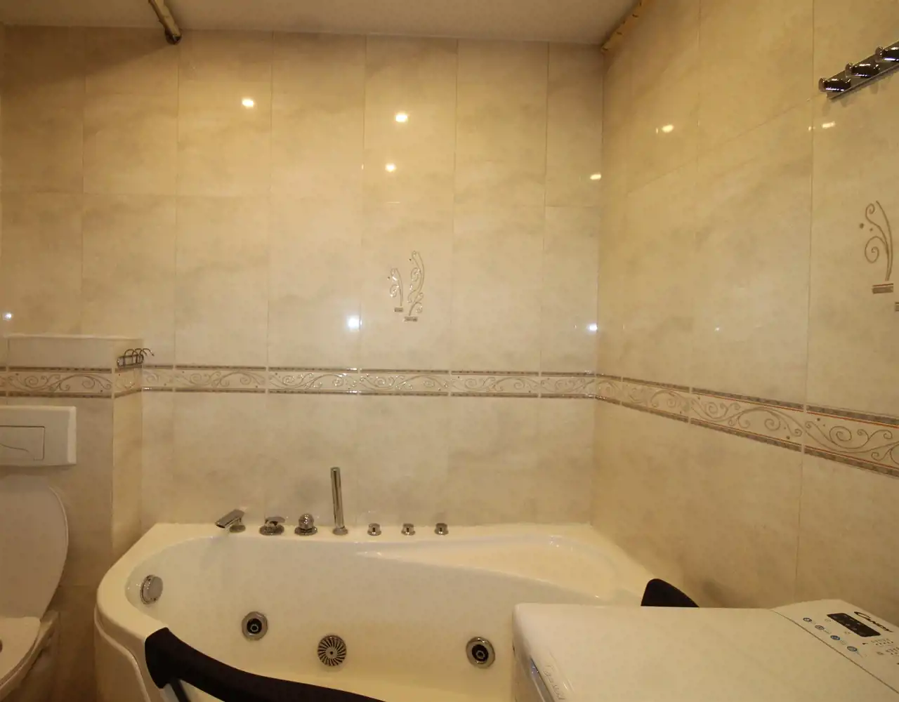 Łazienka z wanną, umywalką, toaletą, wykończona glazurą i terakotą o delikatnym designie, sufit podwieszany.
