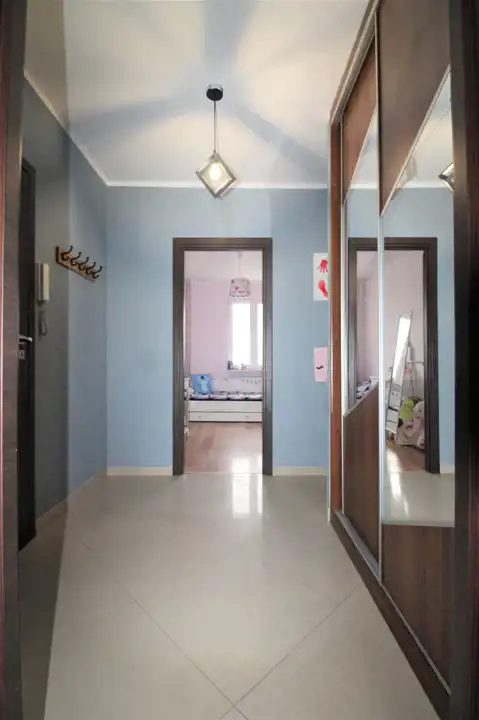 W przedpokoju funkcjonalna szafa z lustarmi typu Indecco.