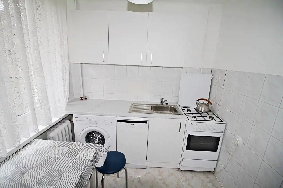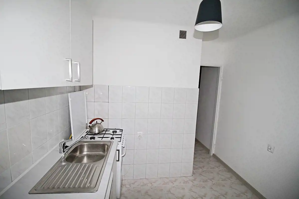 Okna PCV z zamontowanymi żaluzjami . Kuchnia wyposażona w zlew, płyta gazowa,