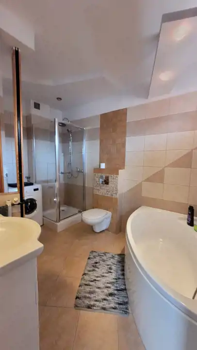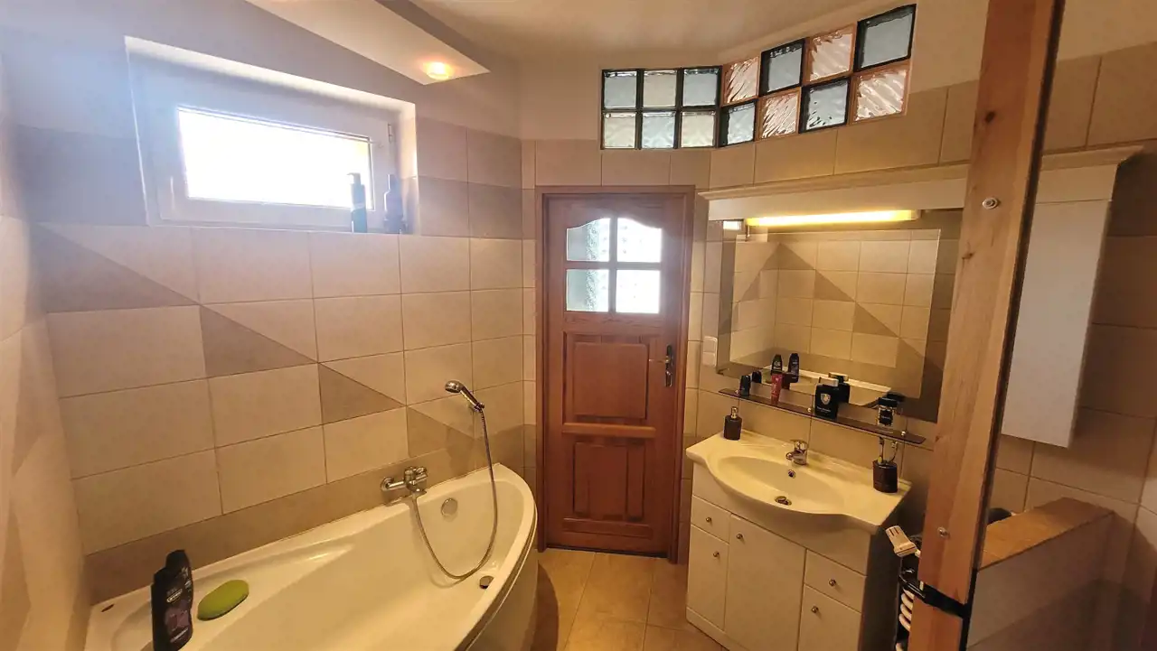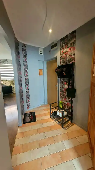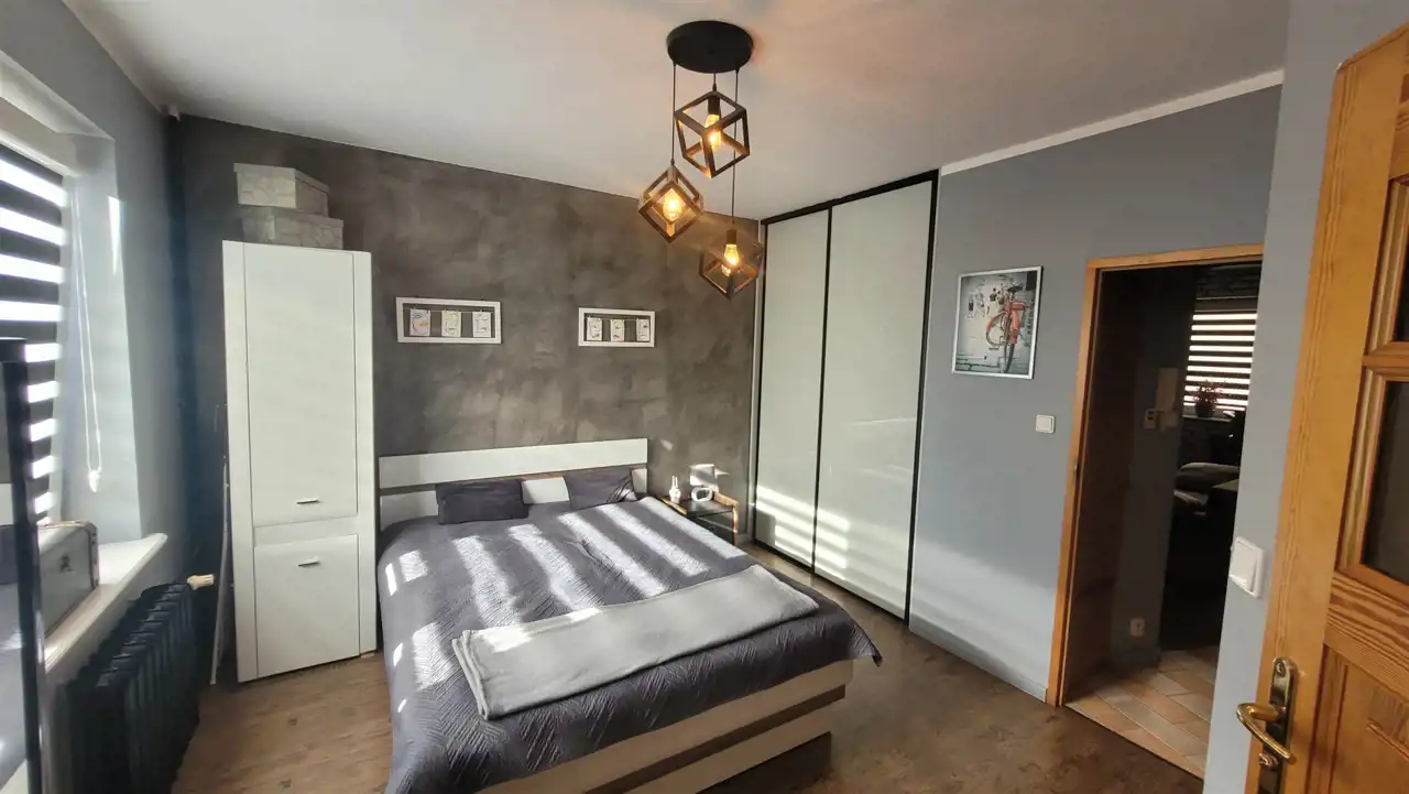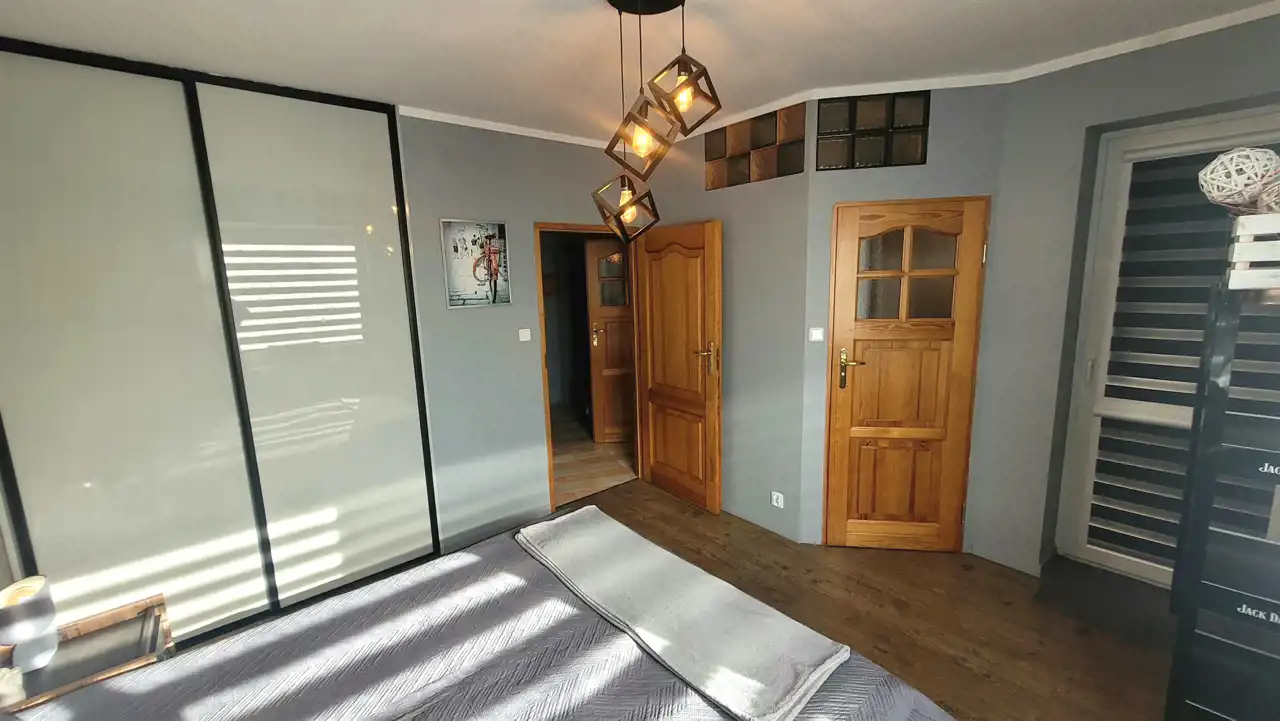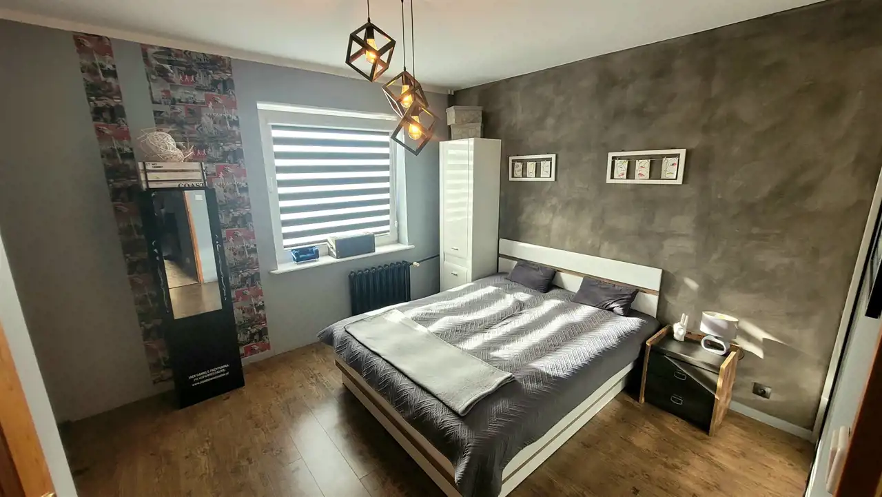 Na podłogach w pokojach, kuchni panele nowego typu, w łazience i przedpokoju gres; natomiast na ścianach w pokojach i przedpokoju tynk ozdobny/ cegiełka/ gładzie malowane a łazience glazura. Okna PCV z nowymi roletami dzień-noc, drzwi wejściowe antywłamaniowe.