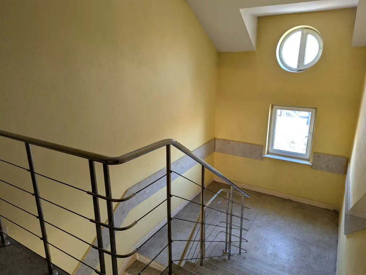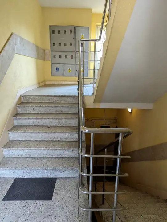 Ładna, czysta klatka schodowa, wyłożona gresem.