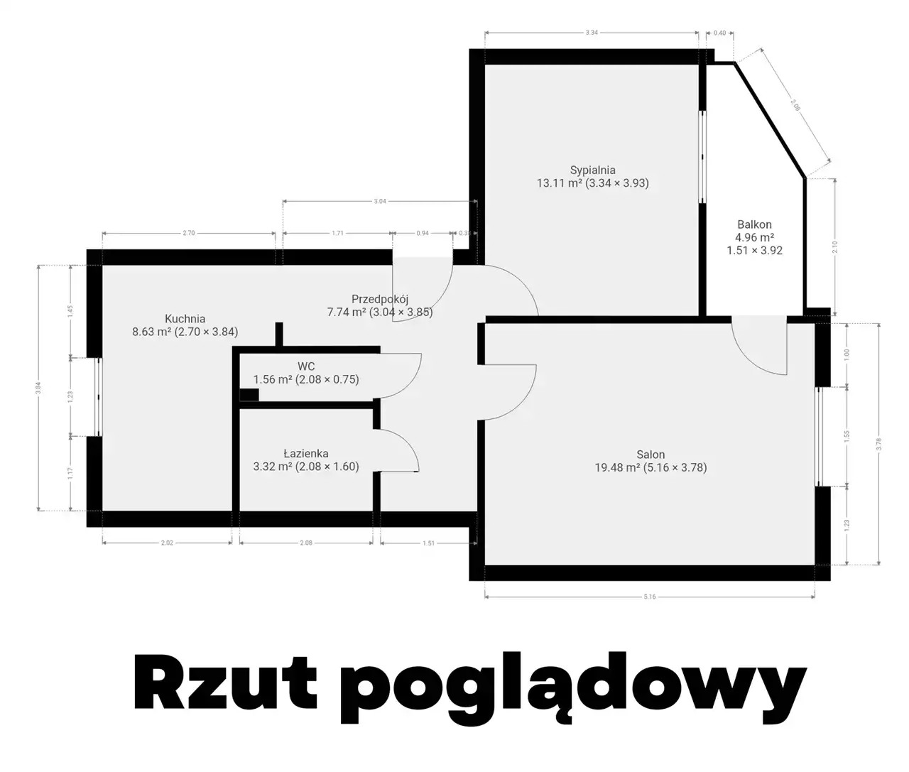Salon z balkonem, sypialnia, jasna kuchnia, łazienka, WC, przedpokój, piwnica.