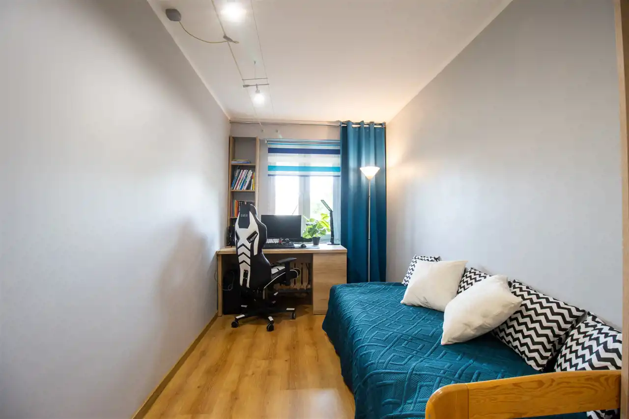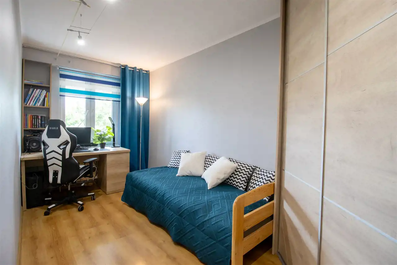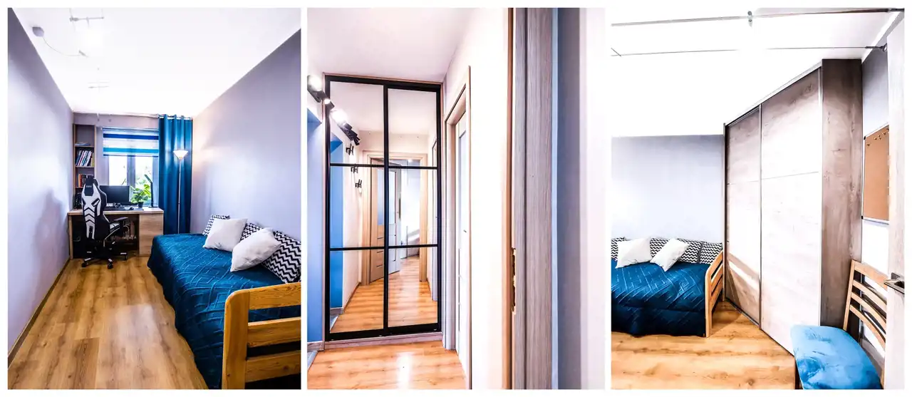 Sypialnia: łóżko, szafa w zabudowie, komoda. Pokój 1: regał, komoda, biurko, łóżko, szafa. Pokój 2: łóżko, biurko, szafa w zabudowie narożna. Przedpokój: lustro, komoda.