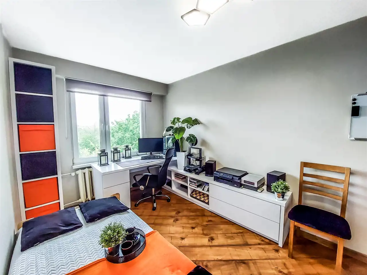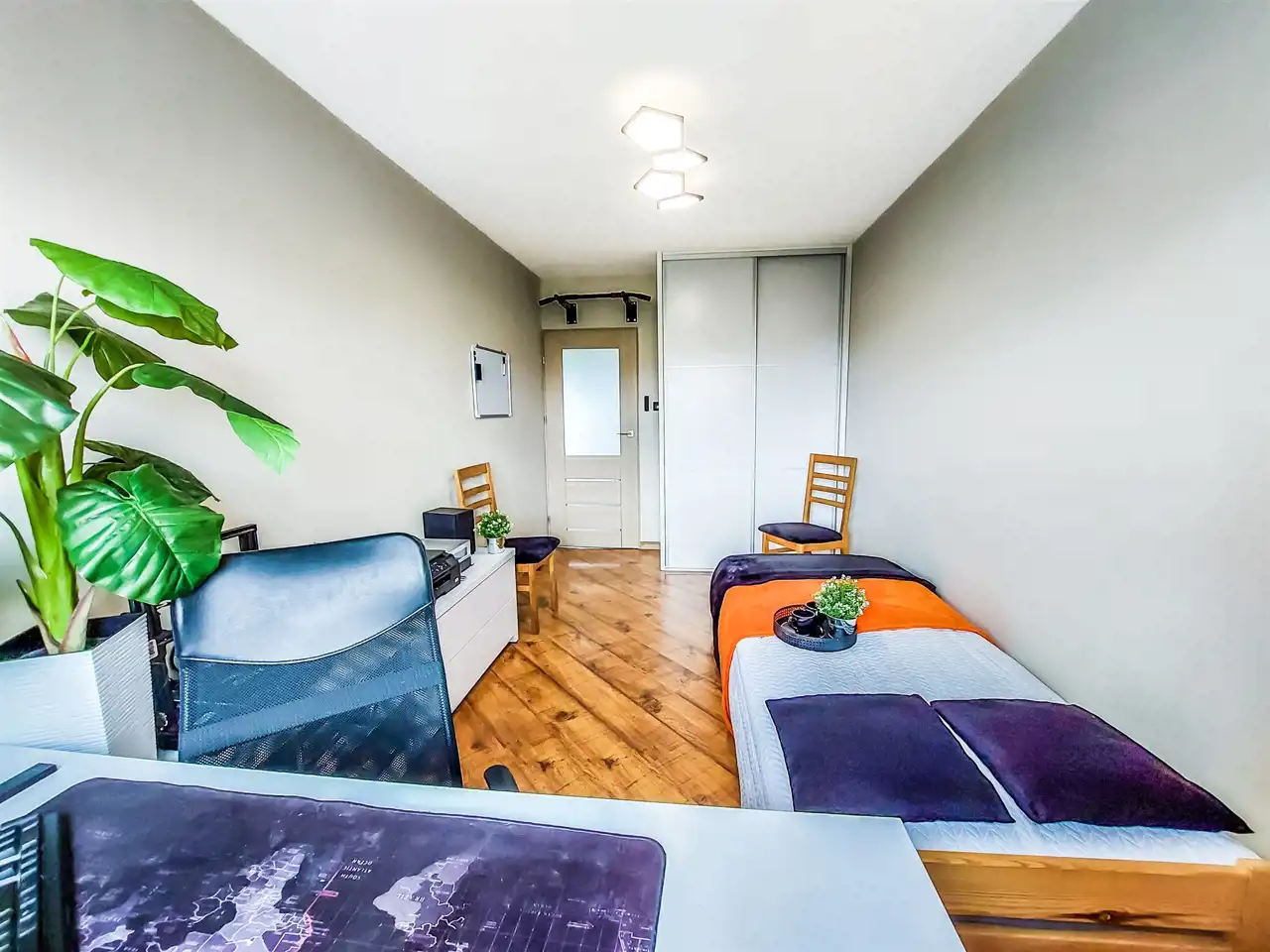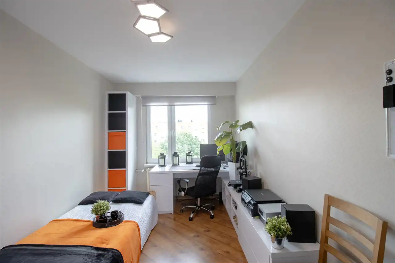 Sypialnia: łóżko, szafa w zabudowie, komoda. Pokój 1: regał, komoda, biurko, łóżko, szafa. Pokój 2: łóżko, biurko, szafa w zabudowie narożna. Przedpokój: lustro, komoda.
