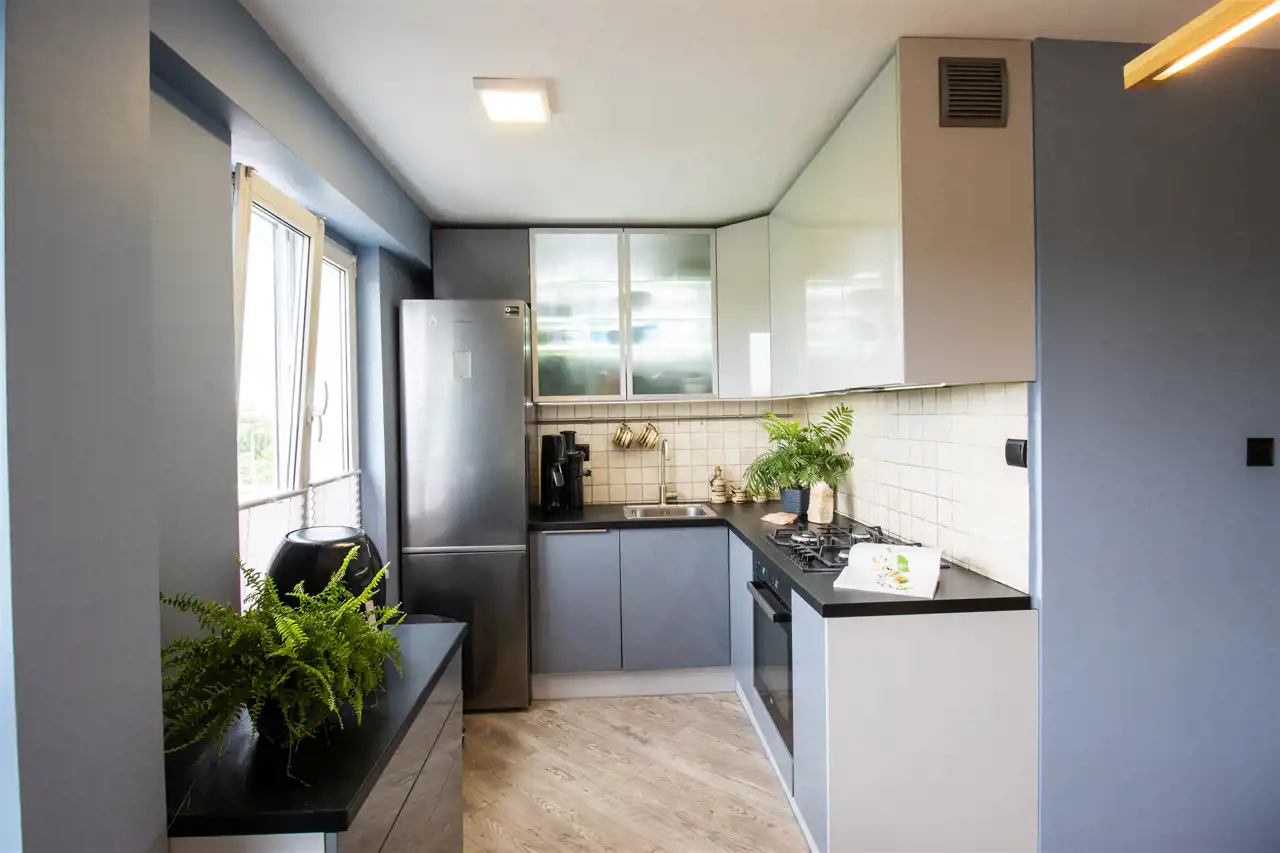 Kuchnia: meble kuchenne, kuchenka gazowa, piekarnik, okap, lodówka, zmywarka.