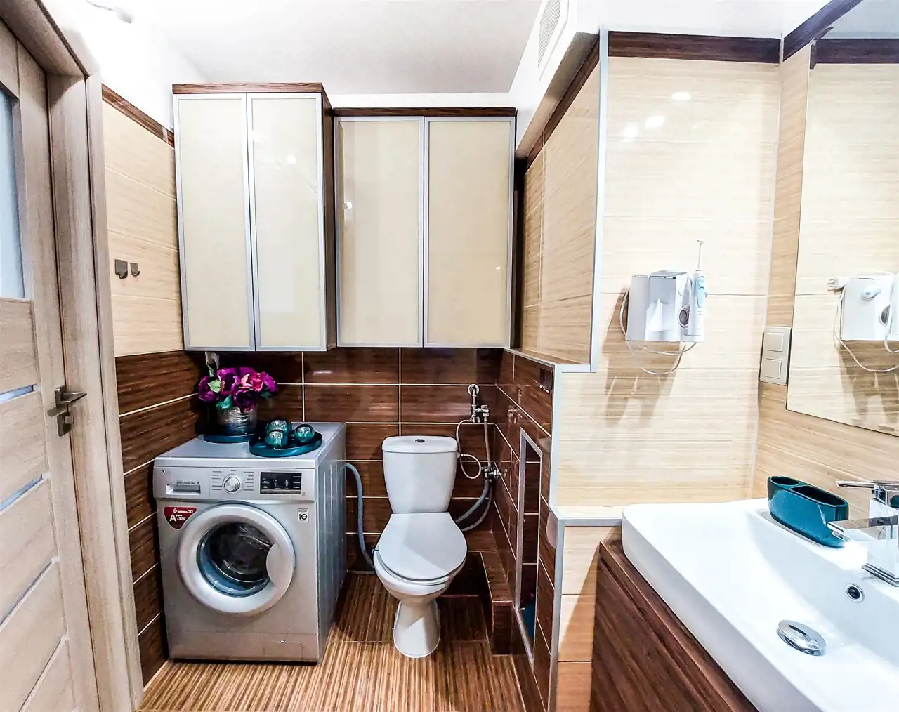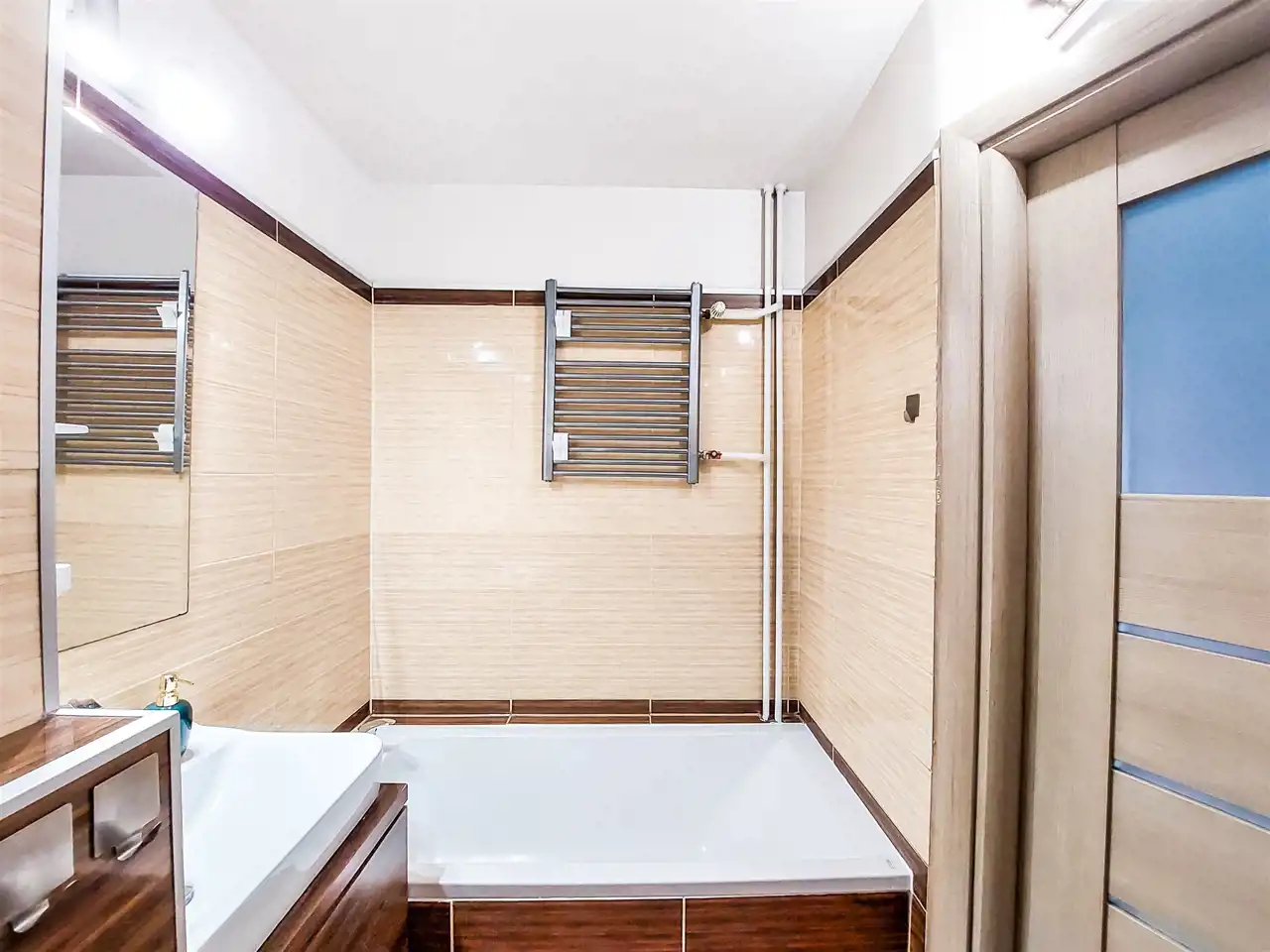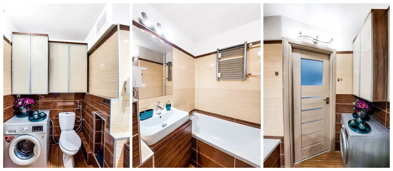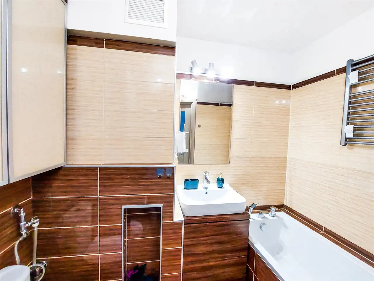 Łazienka: szafka z umywalką, lustro, 2 szafki wiszące, wanna, muszla klozetowa.