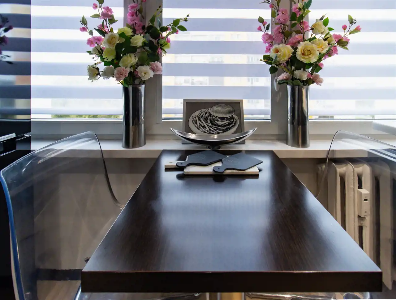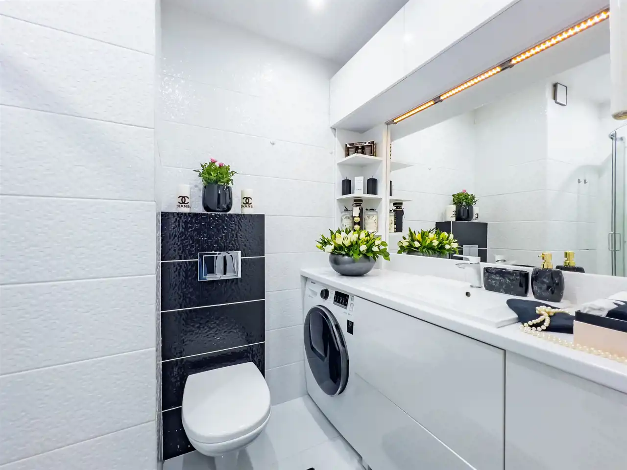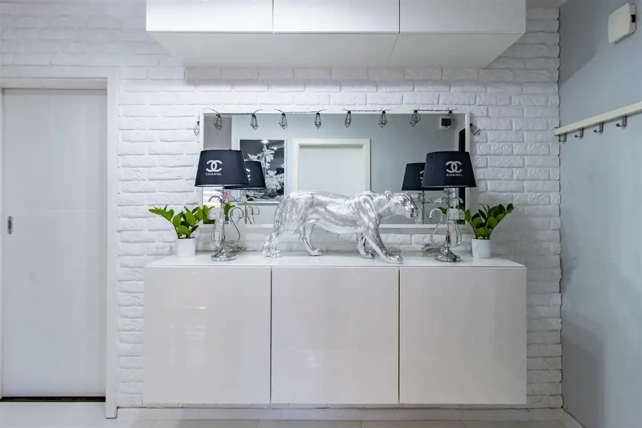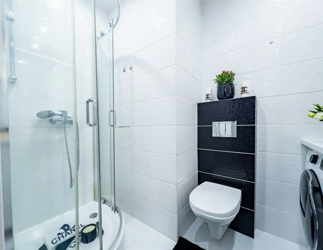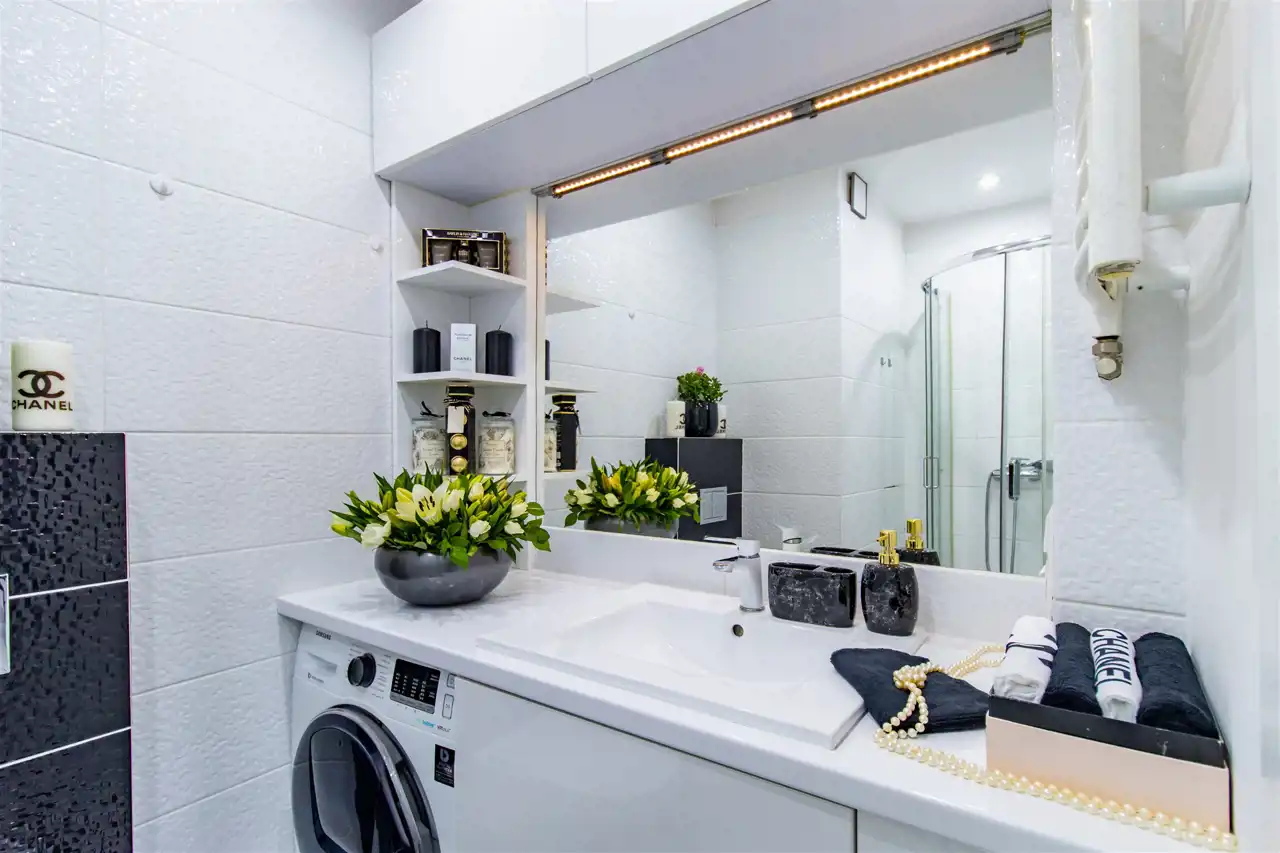 Mieszkanie zachwyca spójną, elegancką kolorystyką, w której dominują biele, odcienie szarości, pudrowego różu oraz czerni – tworząc harmonijną i ponadczasową przestrzeń. Subtelne połączenie barw nadaje wnętrzom wyjątkowy charakter i poczucie przytulnej elegancji. To idealna propozycja dla osób ceniących styl, estetykę i doskonale zaprojektowaną przestrzeń.