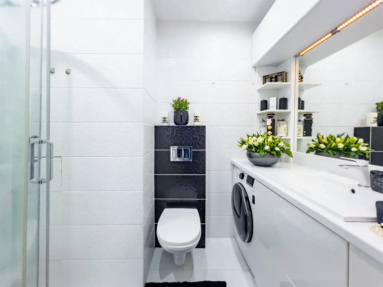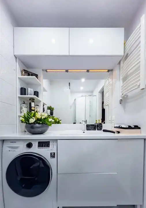 Łazienka: kompletna zabudowa łazienkowa obejmująca meble, lustro, umywalkę oraz pralko-suszarkę, kabina prysznicowa z prysznicem oraz misa WC.