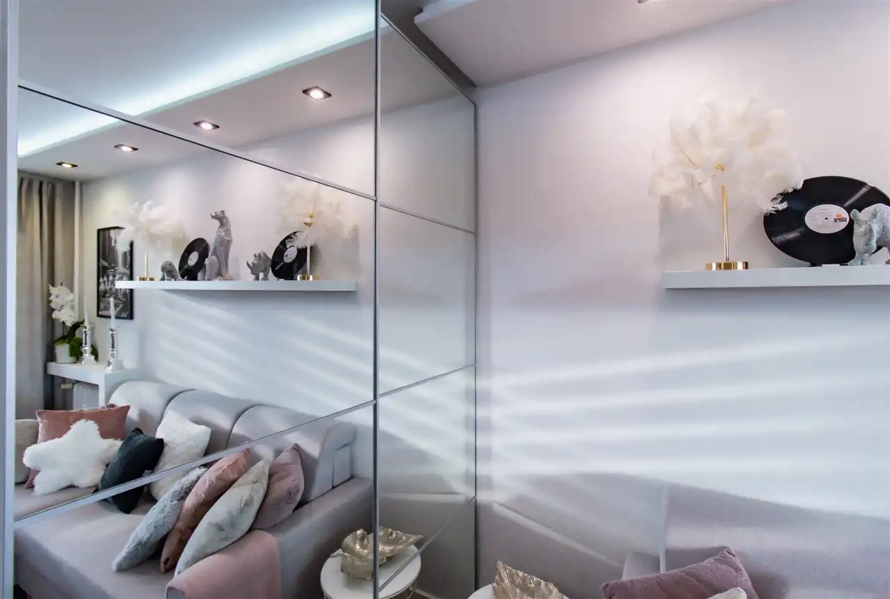 Mieszkanie zaprojektowano z wyjątkową dbałością o ergonomię i maksymalne wykorzystanie przestrzeni – każdy centymetr został przemyślany i funkcjonalnie zagospodarowany. Zastosowano m.in. przesuwne drzwi, które pozwalają zaoszczędzić miejsce i zachować przestronność wnętrz.