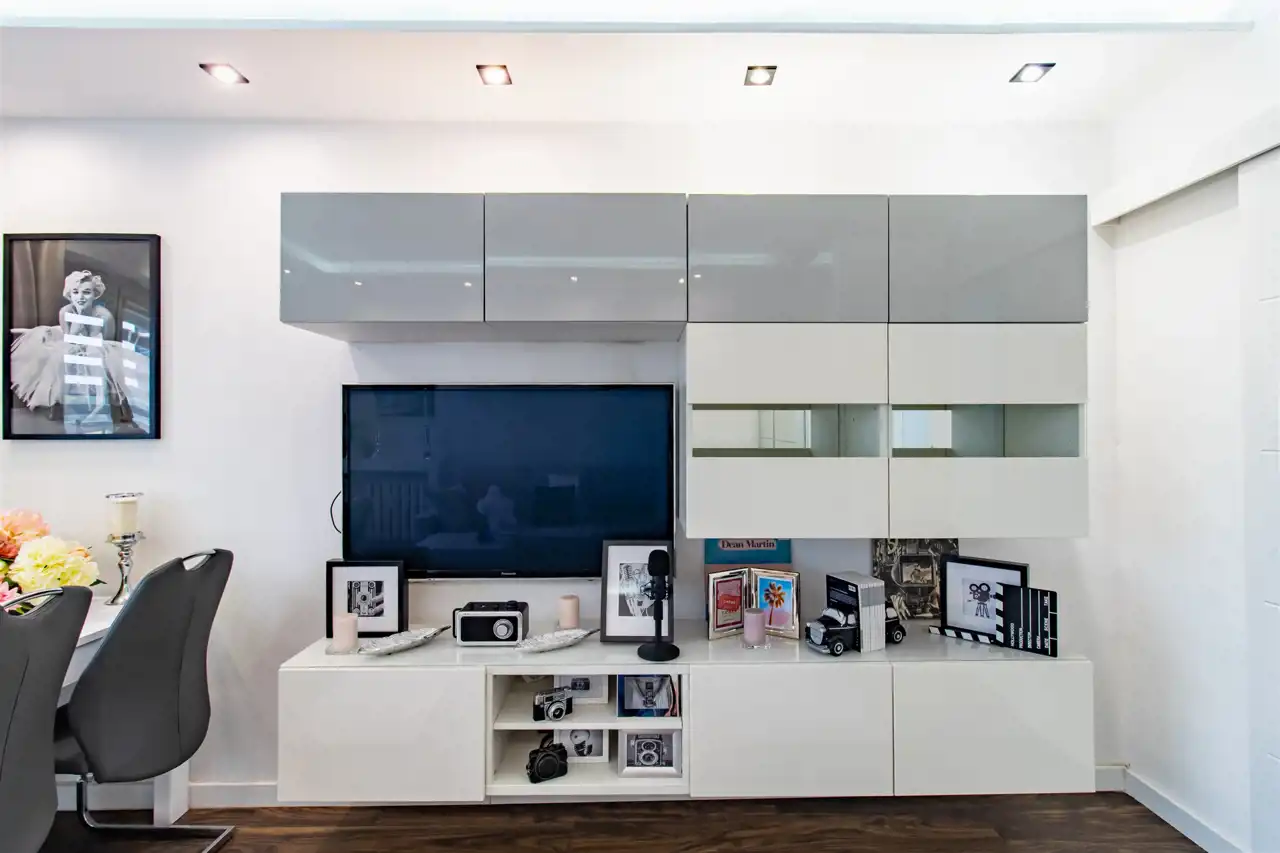 Salon: elegancka szafa z lustrami, zestaw mebli RTV z półkami wiszącymi i telewizorem, półkę ścienną oraz stół z czterema krzesłami.