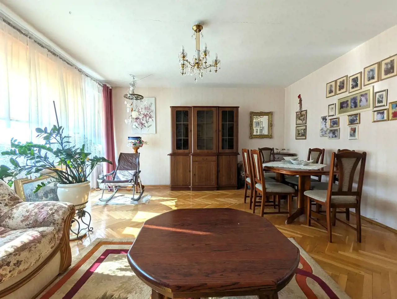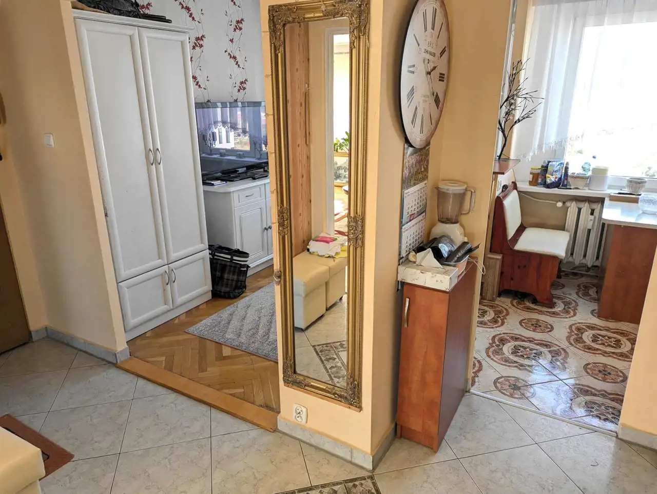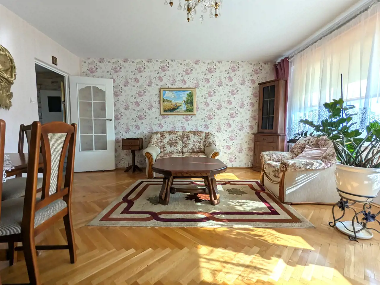 Mieszkanie dwustronne, przestrzenne, jasne, ze średnim balkonem, lekko zmodyfikowany klasyczny rozkład typowego M-4 na Os. Południe – mały pokój połączony z kuchnią, zamieniony na jadalnię, razem 13,92 mkw, salon o powierzchni 24,87 mkw, sypialnia 12,10 mkw, osobno łazienka z wanną, osobno WC - całkowicie wykończone, wolne, do zamieszkania: okna PCW, z roletami materiałowymi od strony południowej, z parapetami, drzwi wejściowe antywłamaniowe „Gerda”, w pokojach na podłodze parkiet dębowy, w przedpokoju na podłodze jasny gres szkliwiony, na jednej ze ścian ozdobne płytki gipsowe, podwieszony plafon z oświetleniem, w łazience glazura i terakota z oryginalnymi dekorami, w WC także jasna glazura, terakota, podobnie w kuchni: kolorowa terakota, jasna glazura, w cenie pozostaje zabudowa meblowa wraz z kuchenką gazową, zmywarką, szafa z drzwiami przesuwnymi w przedpokoju, ewentualnie, na życzenie kupującego, pozostałe umeblowanie.