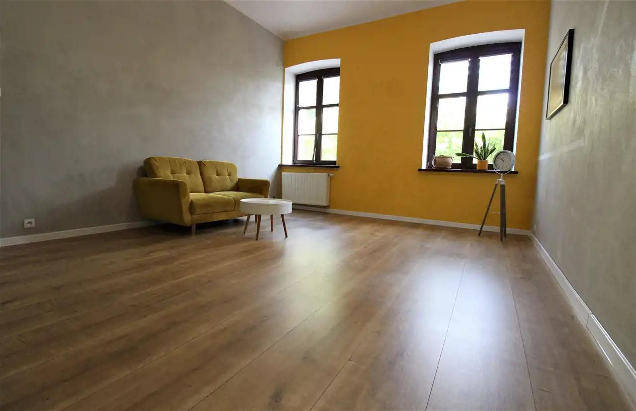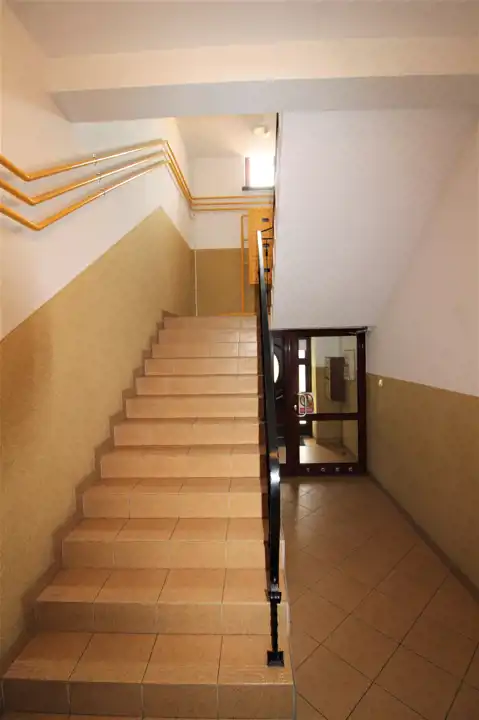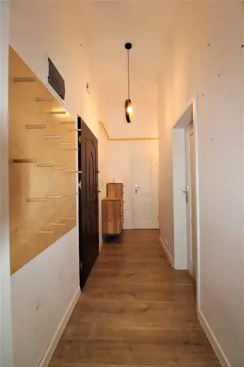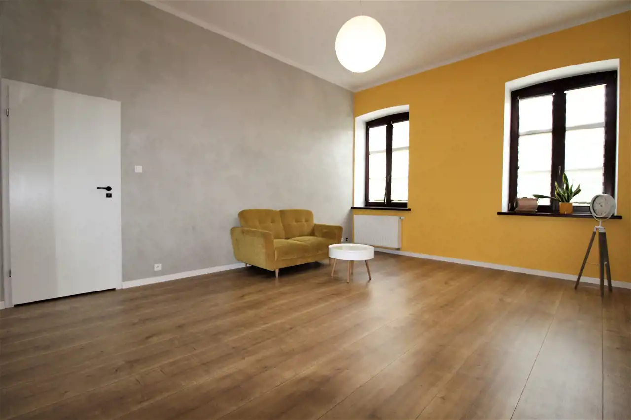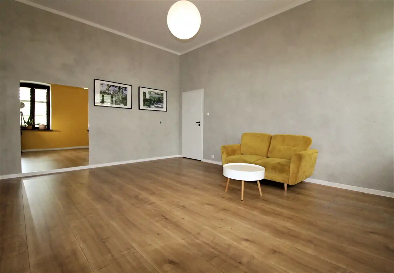 Niestandardowa wysokość pomieszczeń okolo 3,5 m oraz szerokie drzwi zewnętrzne, nadają poczucie przestrzeni i komfortu.