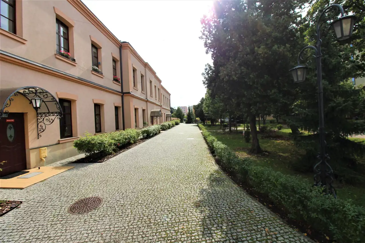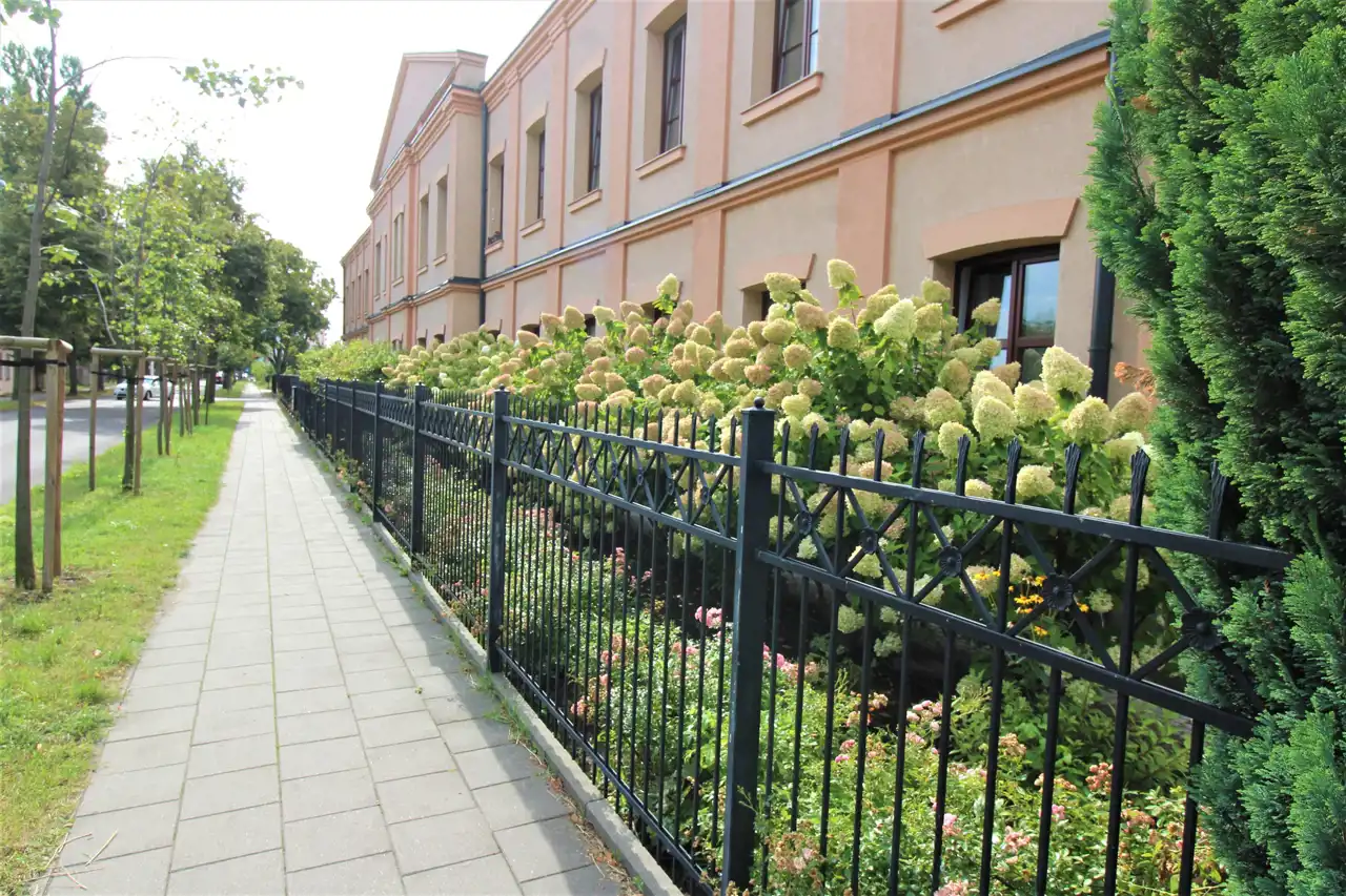 Budynek znajduje się na terenie zamkniętym, monitorowanym, z własnym niedużym skwerkiem z ławkami, zielonymi nasadzeniami, o które z ogromną starannością dba Ogrodnik.