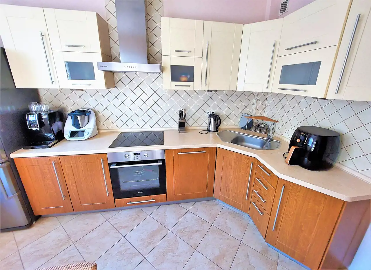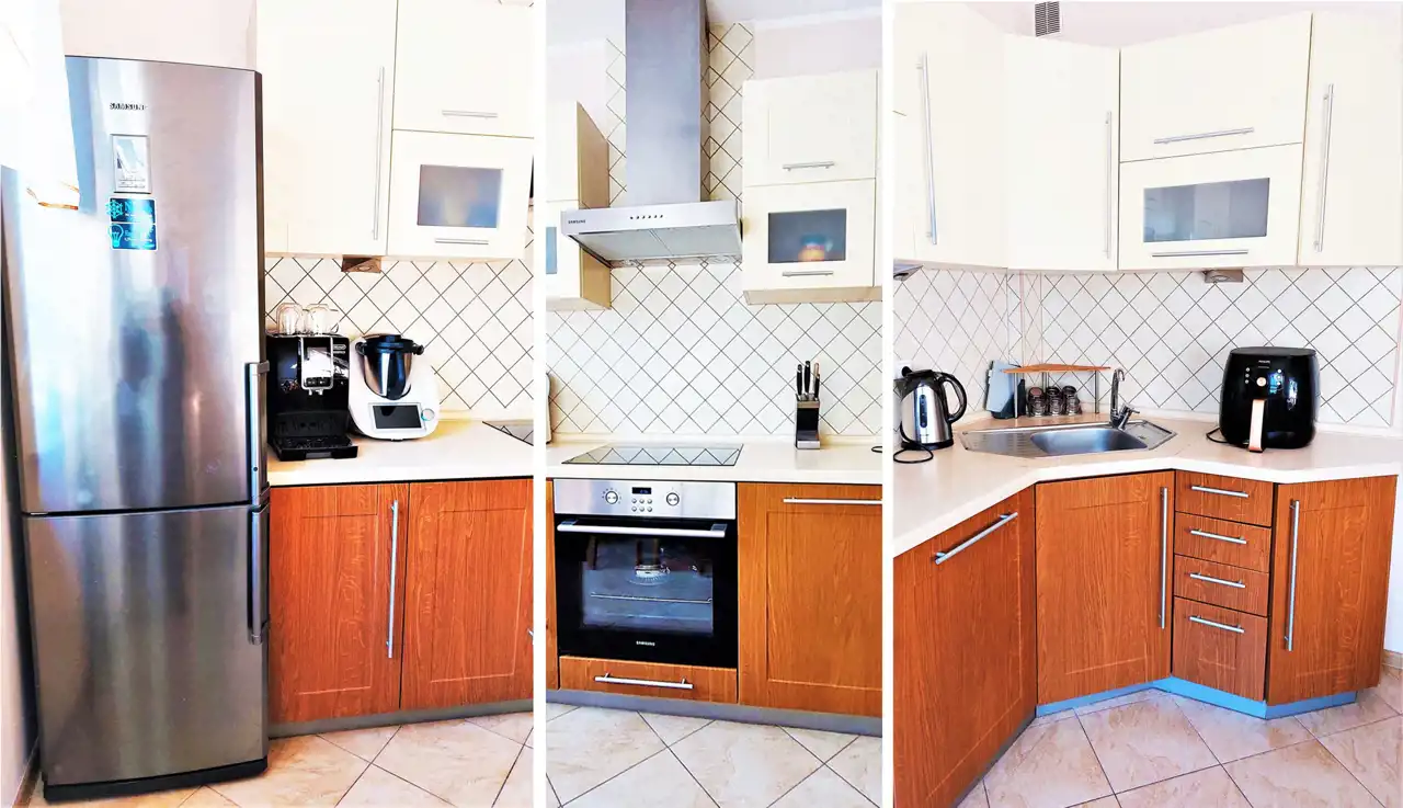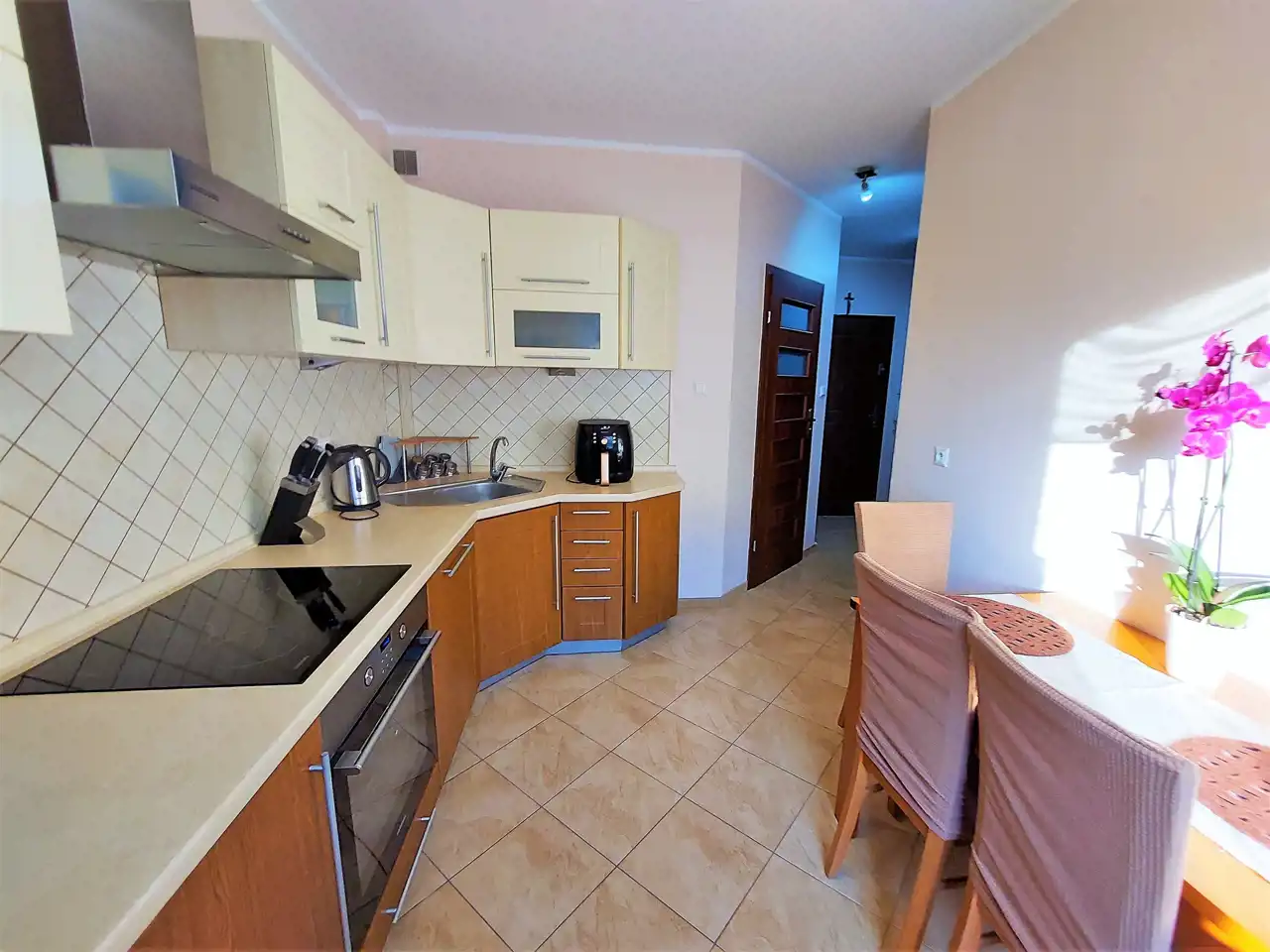 Kuchnia: zabudowa kuchenna, płyta indukcyjna, piekarnik, okap, zmywarka.