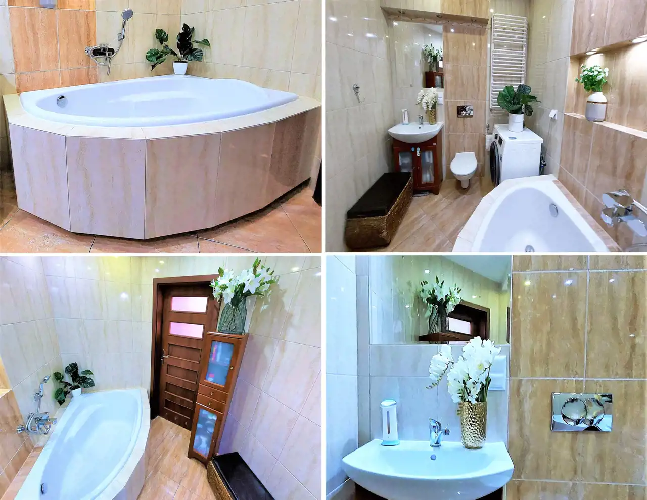 Łazienka: wanna, umywalka plus szafka pod umywalkę, WC, lustro.