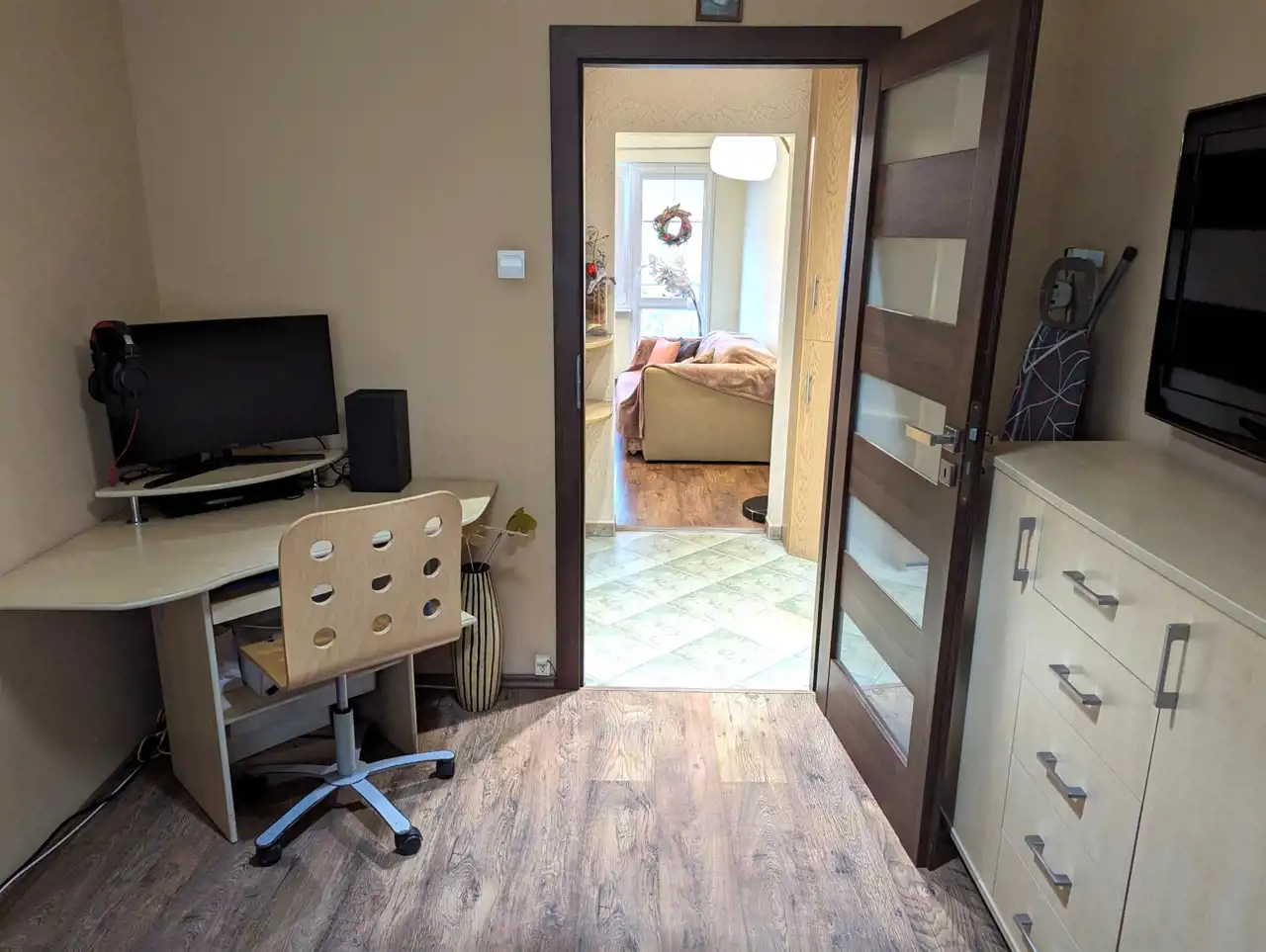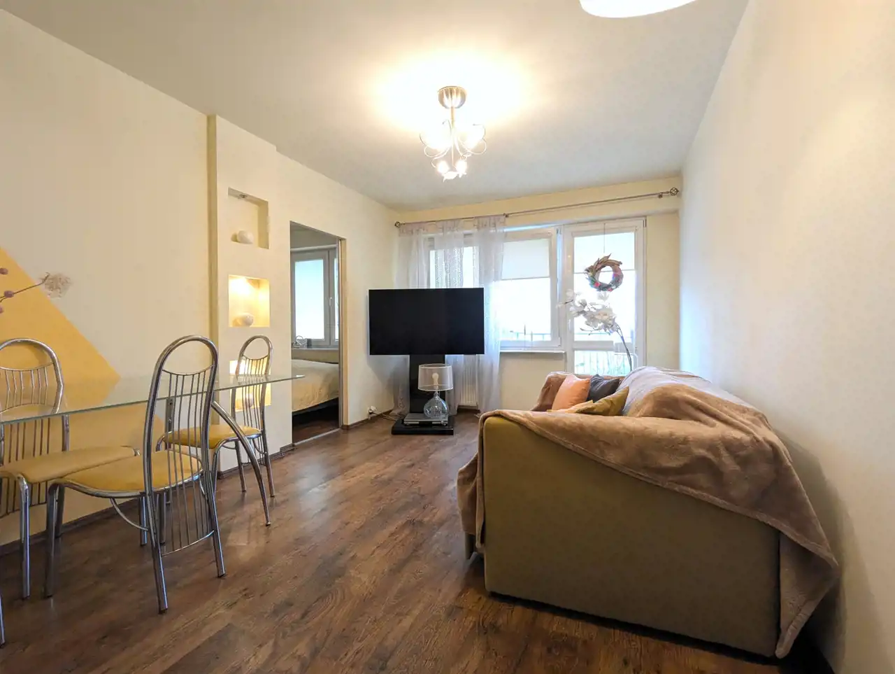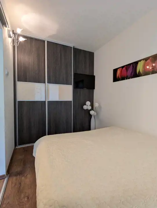 W cenie pozostaje cała zabudowa kuchni, w idealnym stanie, wraz z płytą gazową, piekarnikiem, okapem, lodówką a także szafa z drzwiami przesuwnymi w przedpokoju i pozostałe, widoczne na fotografiach, wyposażenie, prócz telewizora i szafki pod nim.
