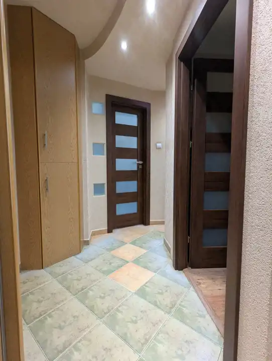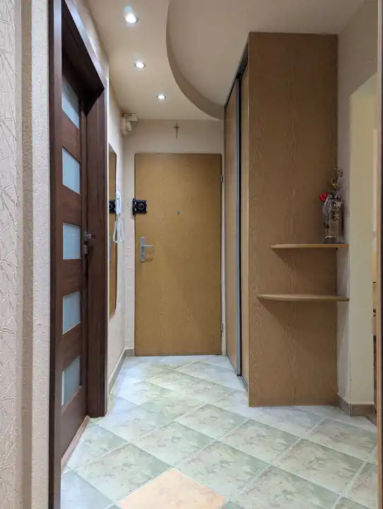 Solidne drzwi wejściowe Gerda, wewnętrzne Verte, do średniego pokoju wejście przez szklane drzwi przesuwne, okna PCW z roletami materiałowymi, instalacja elektryczna częściowo wymieniona na miedzianą, nowa instalacja wodno-kanalizacyjna, nowe grzejniki CO Purmo z podzielnikami, w pokojach na podłodze panele, na ścianach i sufitach gładź, w przedpokoju ozdobny tynk o oryginalnej fakturze, w kuchni i przedpokoju fantazyjnie podwieszone sufity z oświetleniem ledowym.