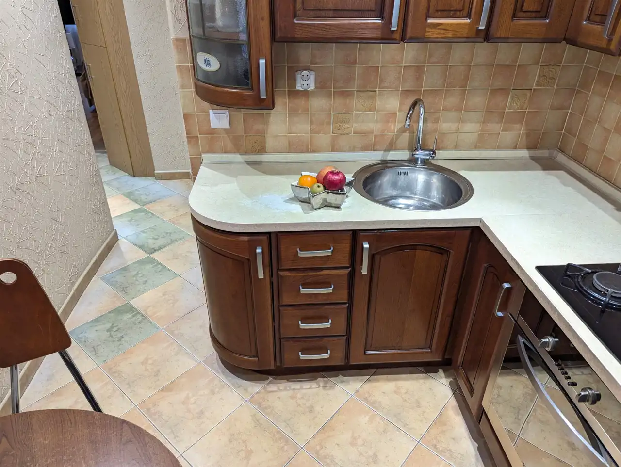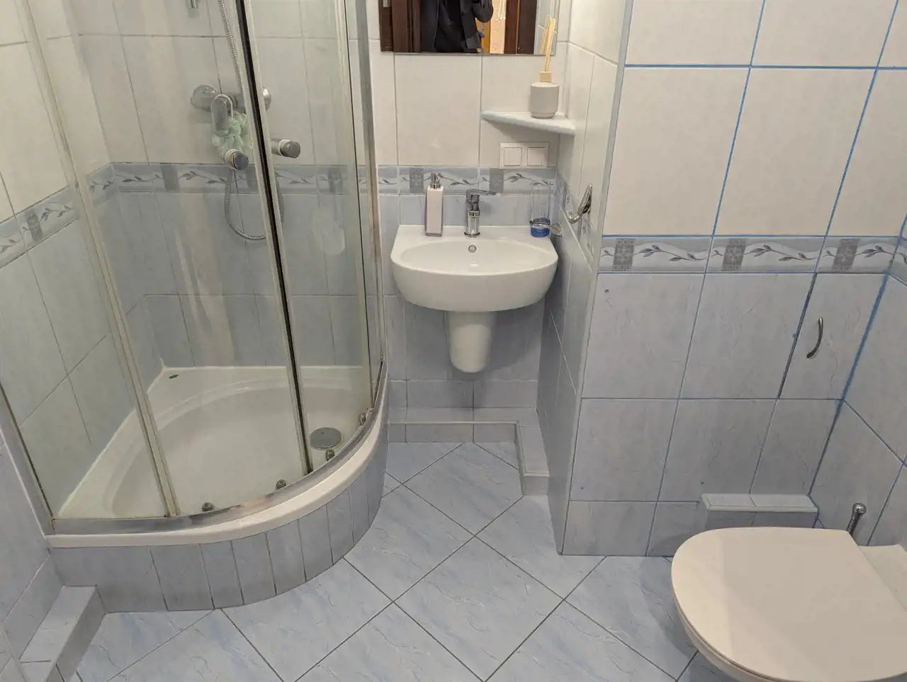W łazience (połączonej z WC i powiększonej), w łagodnym kolorze niebieskim i beżu, jak czysta woda w morzu południowym, na podłodze terakota, na całych ścianach glazura z „płynącym” motywem dekoracyjnym pośrodku, w kuchni jasna glazura i terakota, ciemniejsze, o barwie palisandra, fronty szafek.