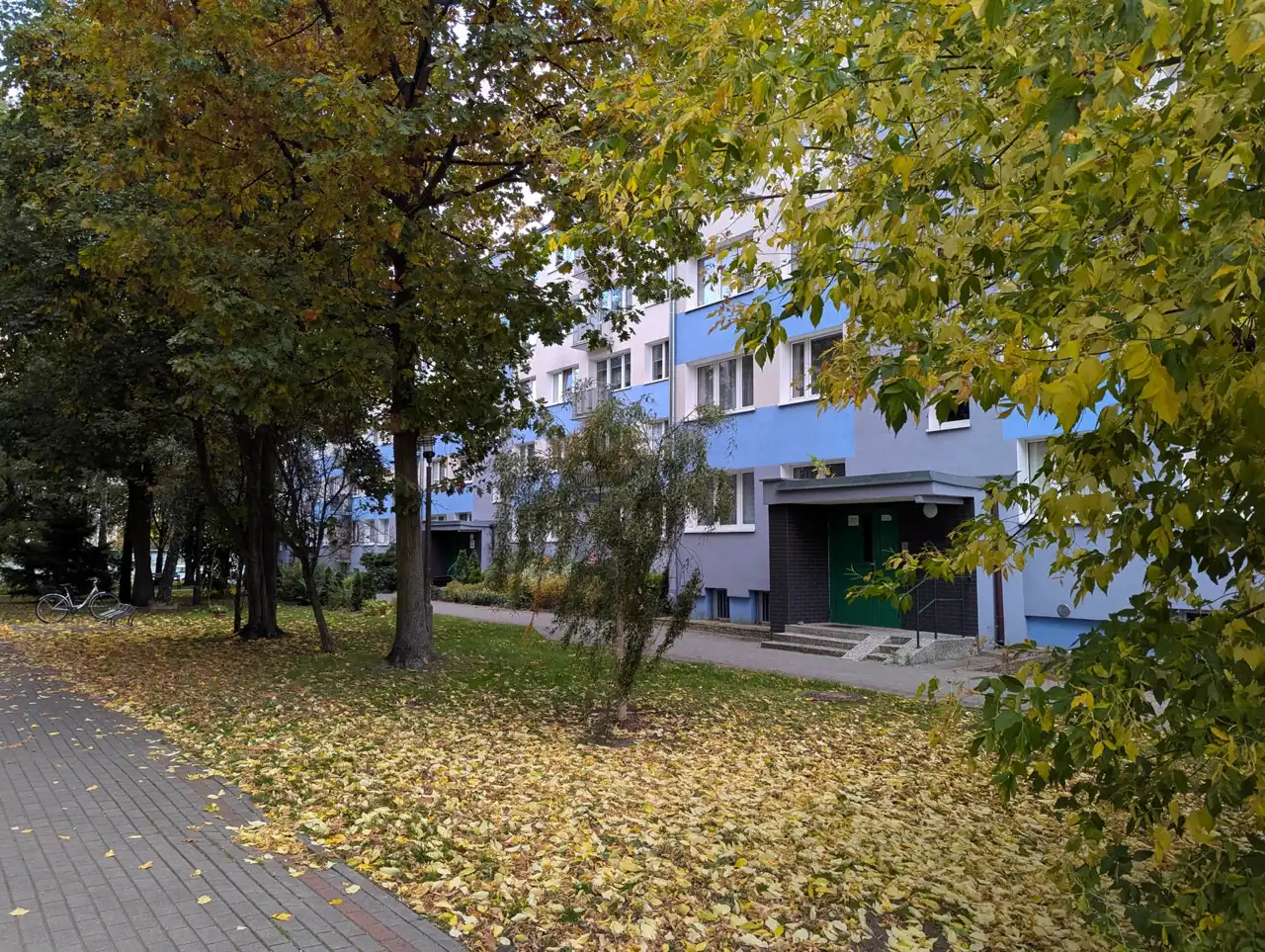 Czysta klatka schodowa, blok ocieplony, z kolorową elewacją, przed blokiem zadbane tereny zielone, kwiaty, krzewy, drzewa.