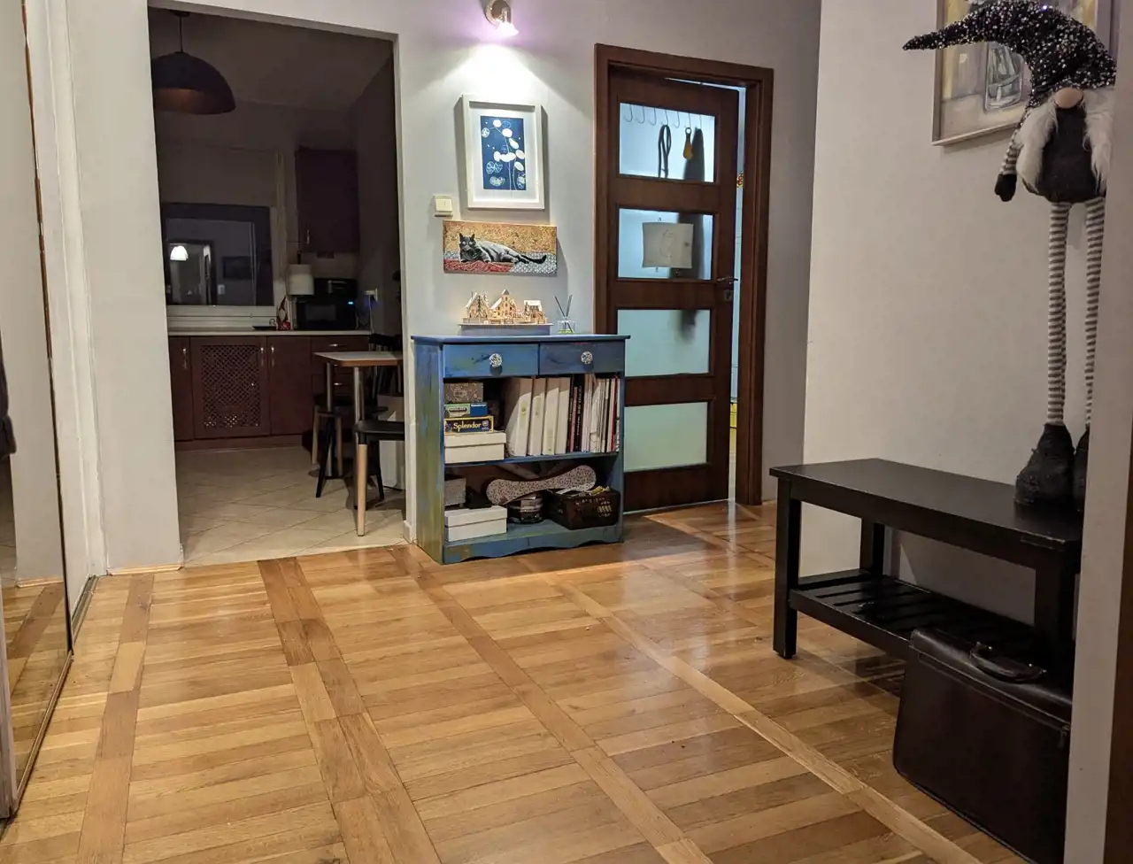 Okna PCW z roletami, na balkonie zewnętrznymi, wymienione drzwi, w pokojach i w przedpokoju na podłodze parkiet, na ścianach i suficie gładź, w łazience z WC – glazura, terakota, podwieszony sufit z oświetleniem ledowym, w kuchni także glazura i terakota, w cenie pozostają meble kuchenne, szafa z drzwiami przesuwnymi, z lustrem, w przedpokoju.