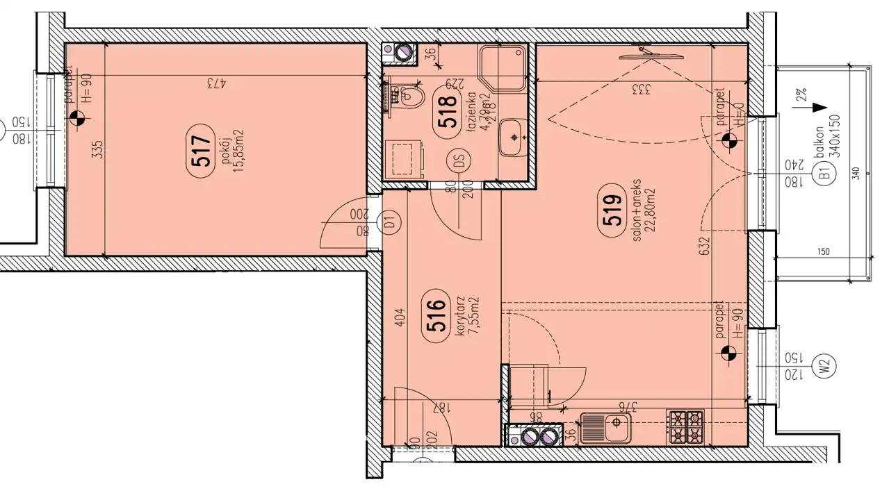 - Charakterystyka mieszkania 50.99 m2, 2 pokoje