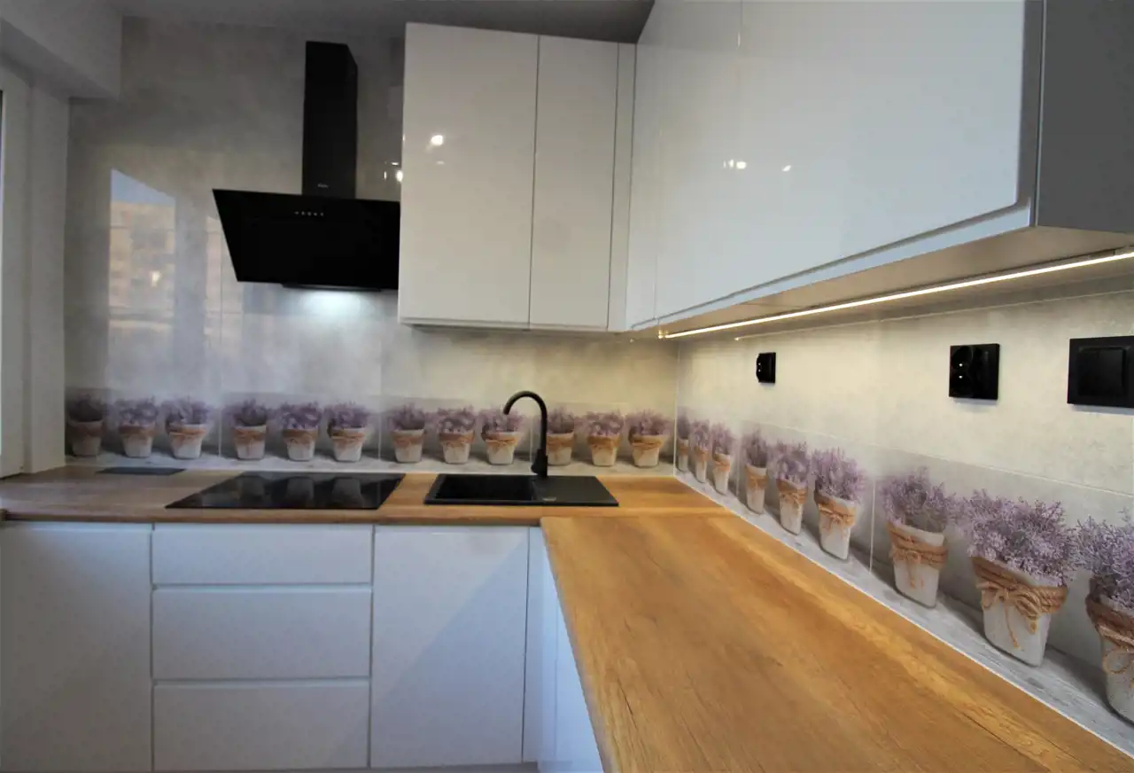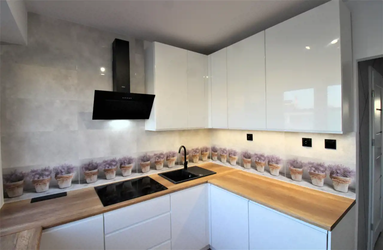 W pokojach na posadzkach najmodniejszy wzór paneli w ślicznym kolorze dębu, w kuchni między szafkami płytki z wzorem lawendy.