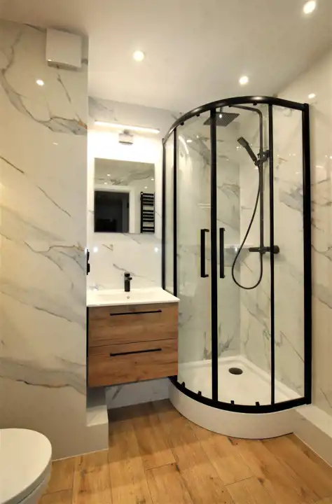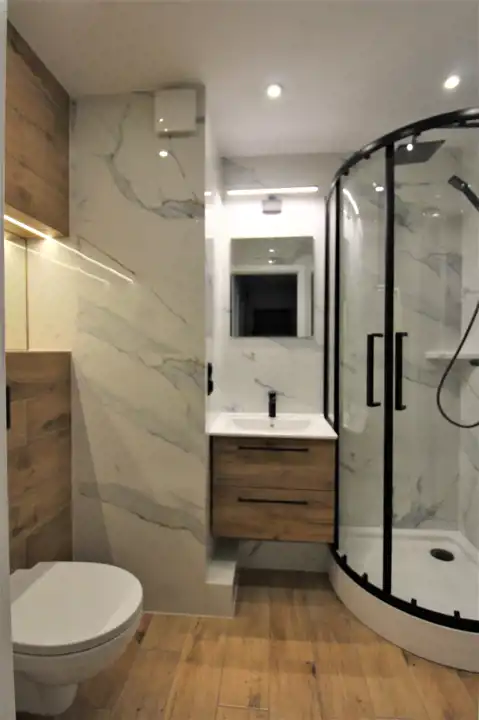 -funkcjonalnej, stylowo wykończonej łazienki z kabiną prysznicową, umywalką, lustrem, toaletą i miejscem na pralkę;