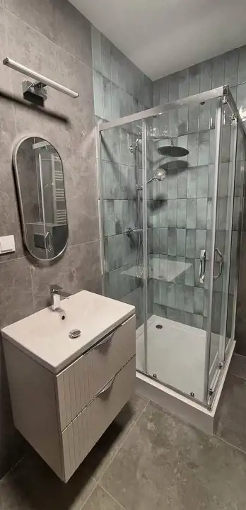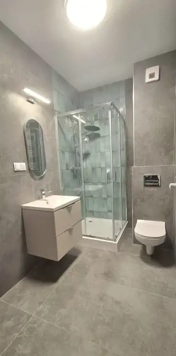 Łazienka: Nowoczesna, wykończona w wysokim standardzie, wyposażona w kabinę prysznicową oraz WC.
