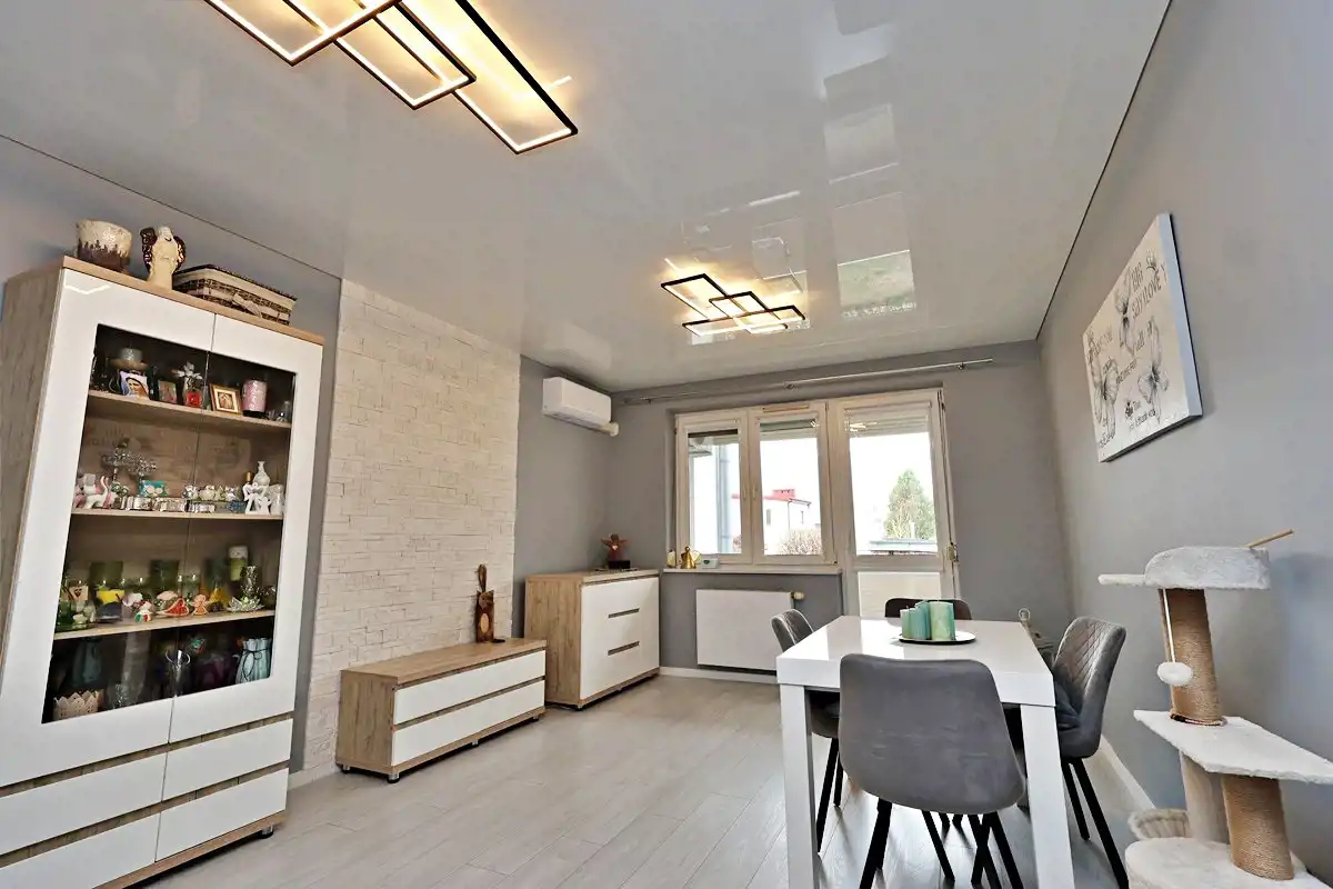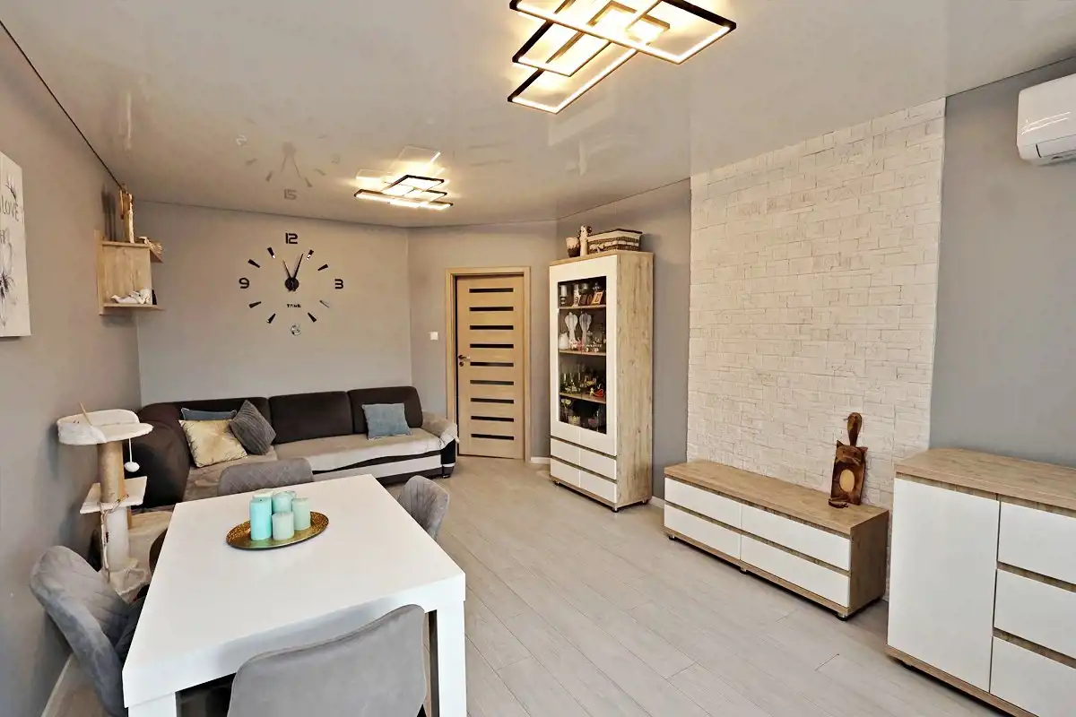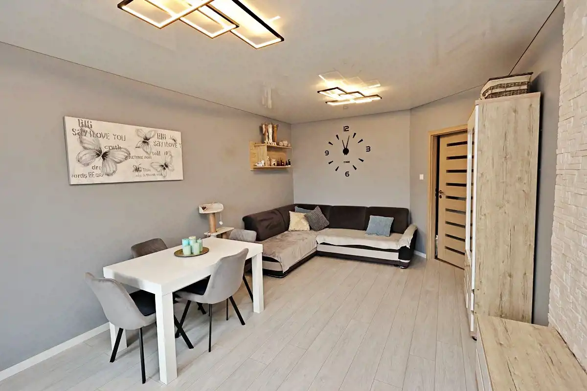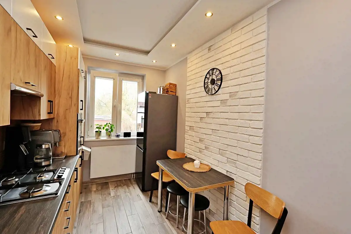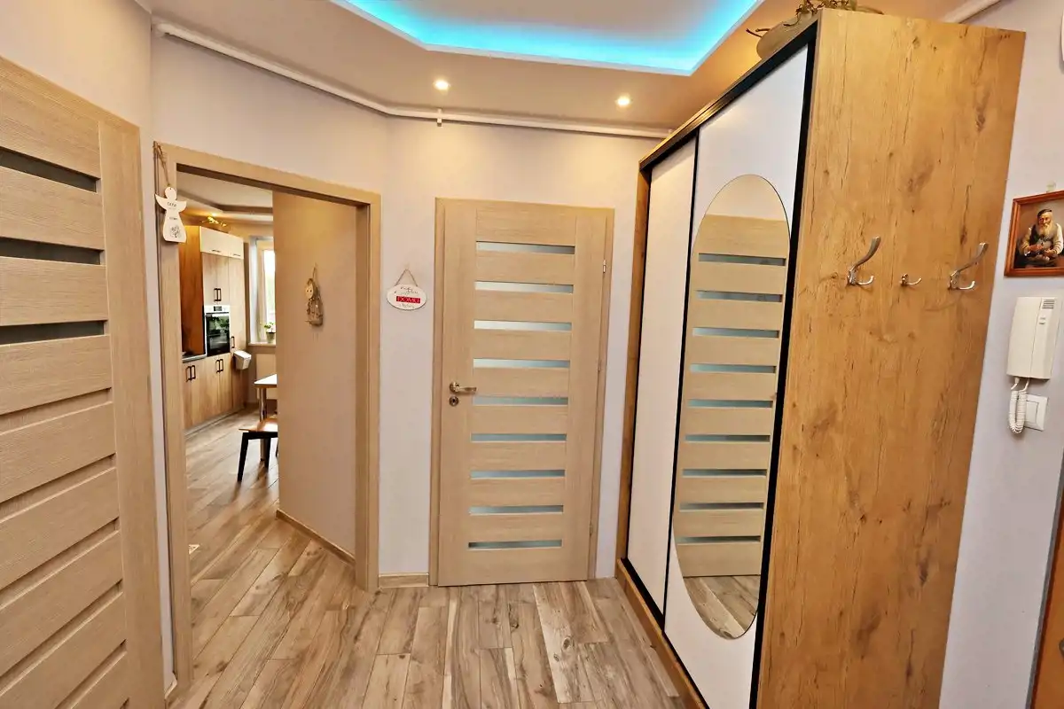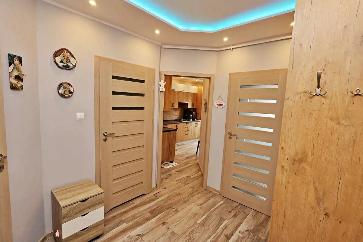 Mieszkanie nowocześnie urządzone , gotowe do wprowadzenia. Nie wymaga nakładów finansowych. Okna PCV na balkonie zamontowane żaluzje antywłamaniowe . Na podłogach w pokojach panele . W przedpokoju szafy w zabudowie. Kuchnia z nowoczesną zabudową, zmienne punkty świetlne w podwieszanym suficie , sprzęt AGD ( piekarnik, okap, zmywarka, lodówka) wydzielone miejsce na stolik z krzesłami. Przestronny salon z wyjściem na duży balkon , ściany w jasnych kolorach, sufit napinany.