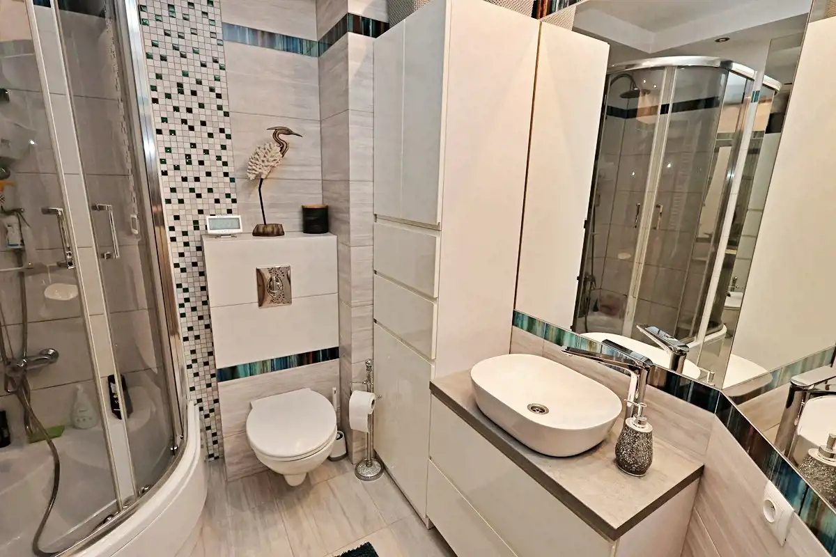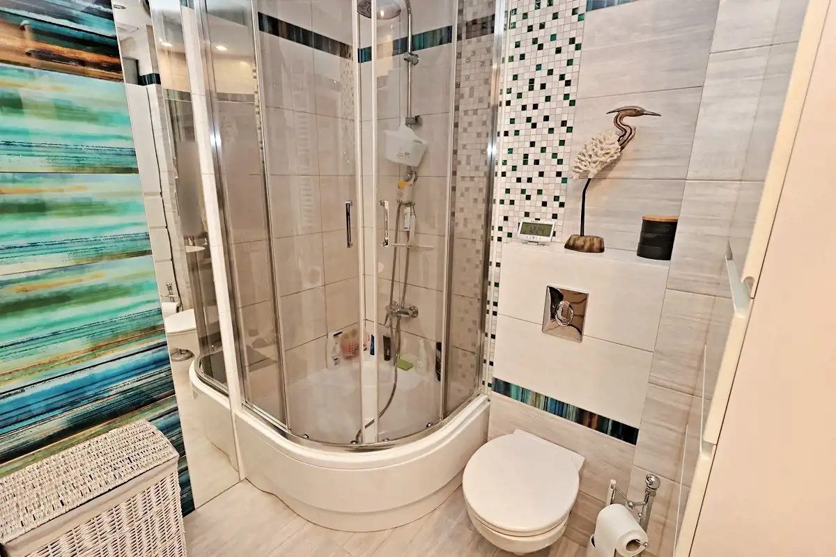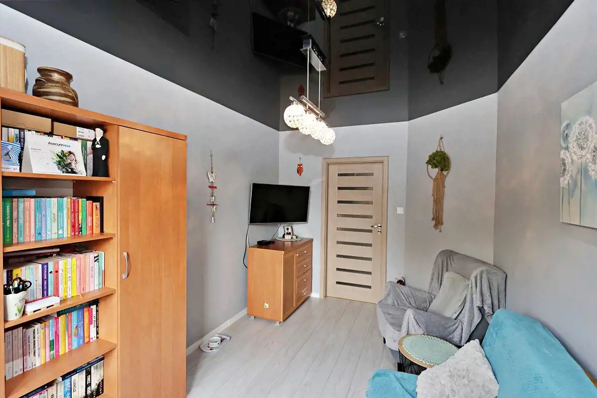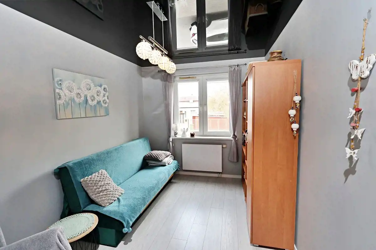 Pokoj sypialniany ustawny , ściany malowane, sufit napinamy . Drzwi wewnętrzne idealnie komponują się w ogólną kolorystykę wnętrza . Łazienka z natryskiem , umywalka z zabudowaną szafką , podświetlane lustro, miejsce na pralkę, szafki.