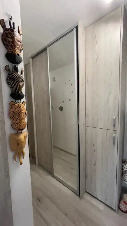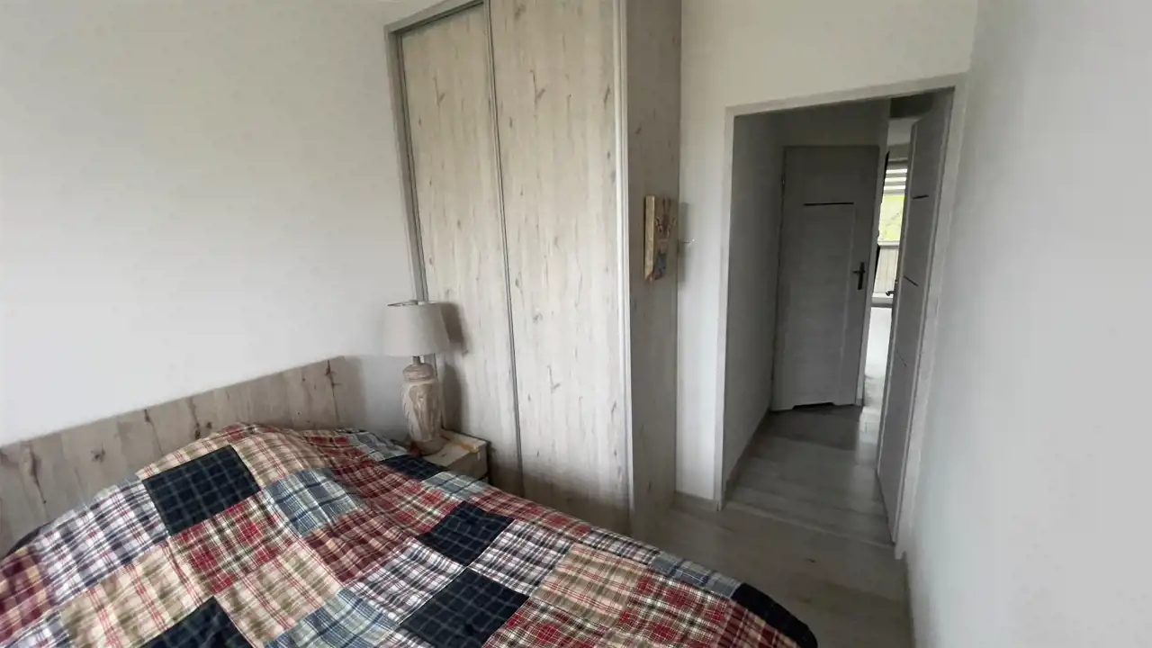 Wszystko z „górnej półki”, czyste, zadbane, wnętrze nowoczesne, ale jednocześnie ciepłe i przytulne, dominuje naturalny rysunek drewna paneli, szaf w zabudowie, szafek w aneksie kuchennym, do wypoczynku zaprasza ogromna kanapa narożna w salonie.