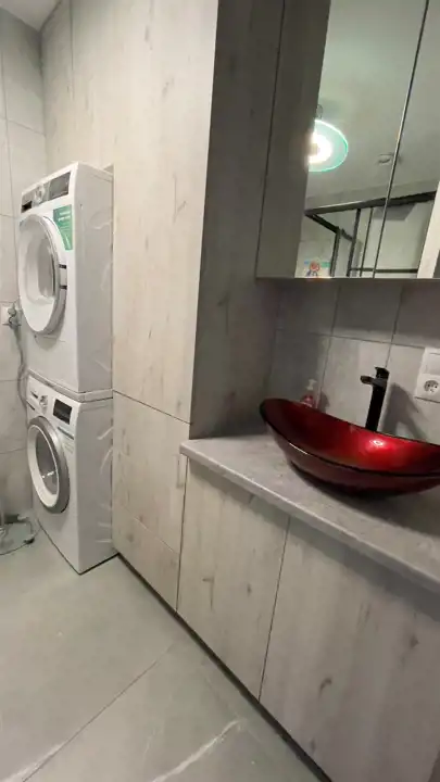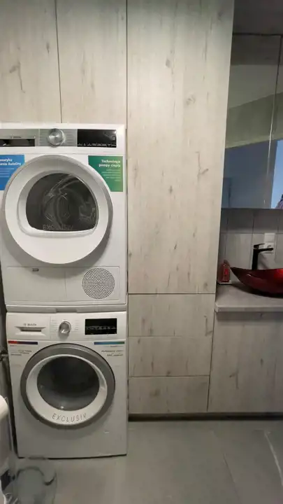 W cenie pozostaje całe umeblowanie i wyposażenie – szafki kuchenne stojące i wiszące, z wbudowaną płyta gazową „Electrolux”, piekarnikiem elektrycznym, z wyciągiem „Teka”, zmywarką i dużą lodówką „Bosch”, w łazience pralka, suszarka, też firmy Bosch, szafy w przedpokoju w stałej zabudowie, z lustrem, szafa w sypialni a także pozostałe, widoczne na zdjęciach meble ruchome (prócz ławy w salonie) i niebanalne oświetlenie.