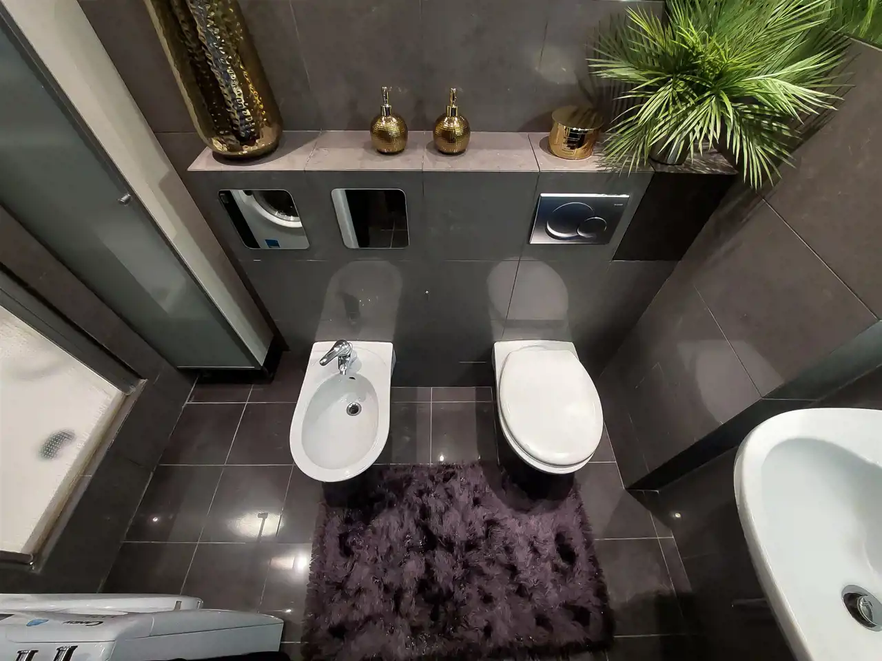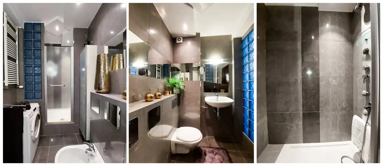 Łazienka: umywalka, prysznic, toaleta, bidet, pralka, witryna, lustra.