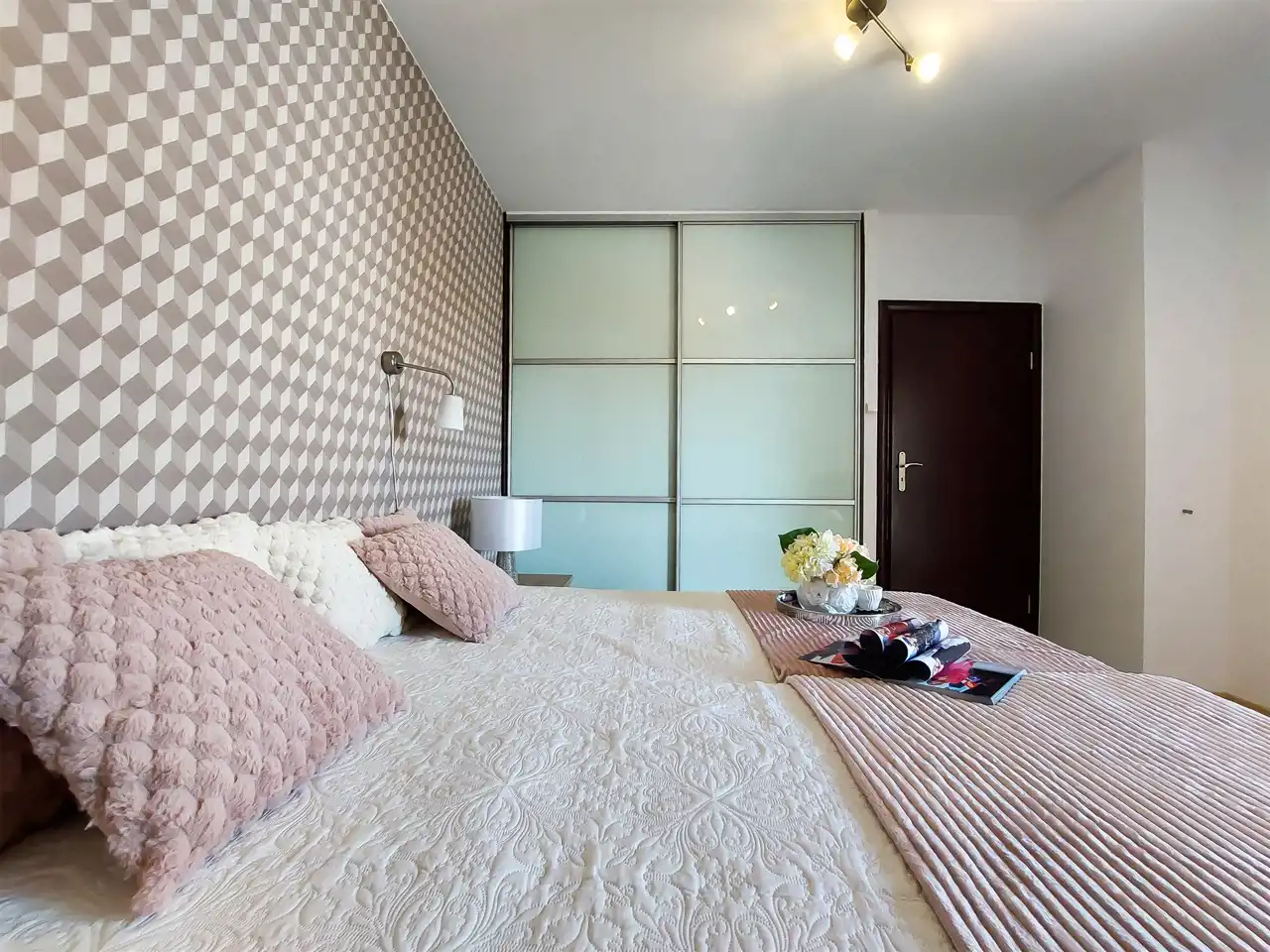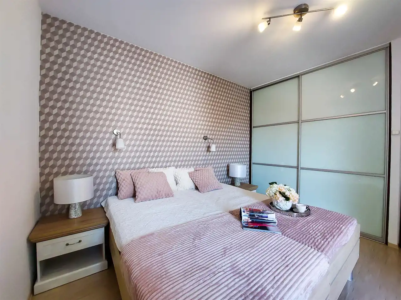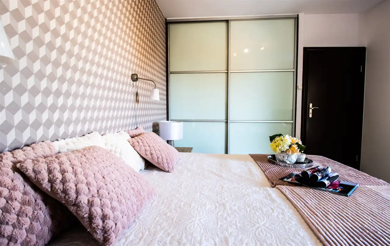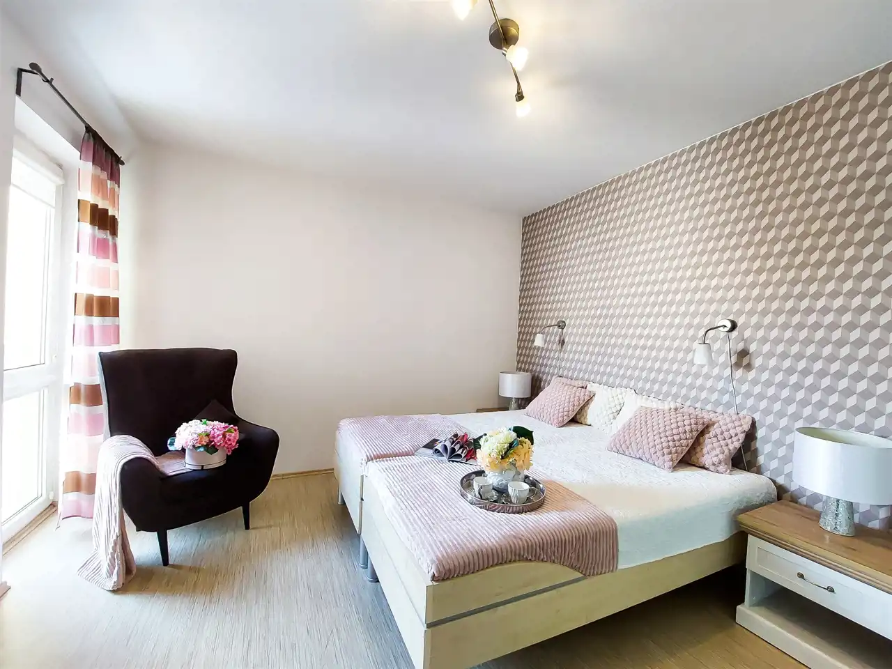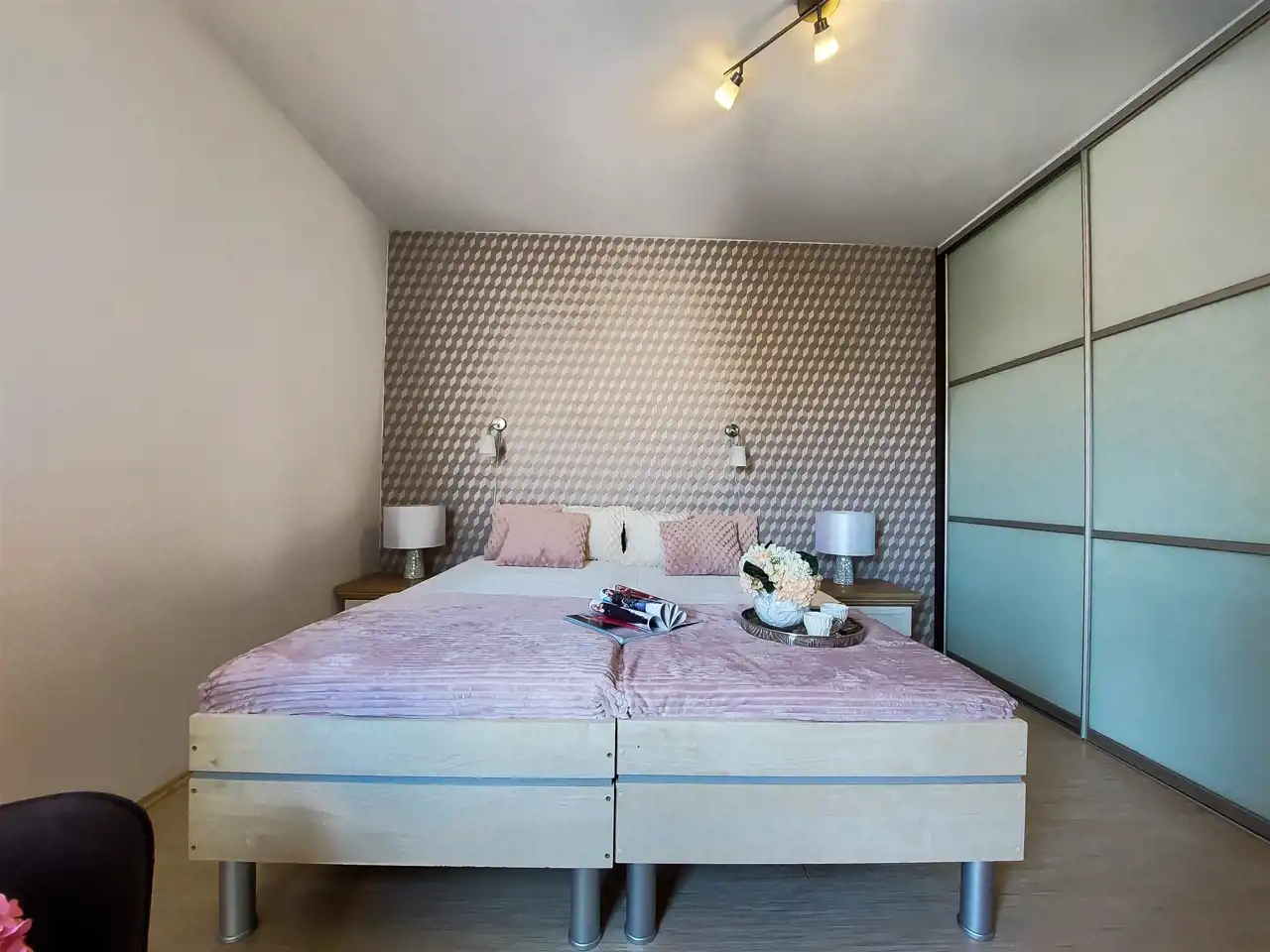 Sypialnia: 2 łóżka, fotel, szafa w zabudowie, dwie szafki nocne.