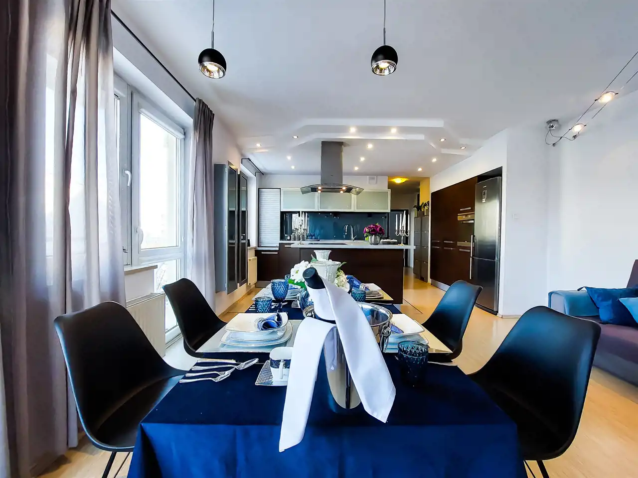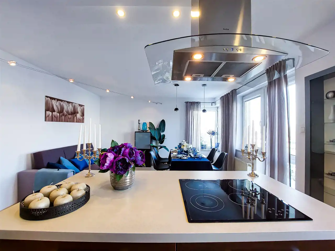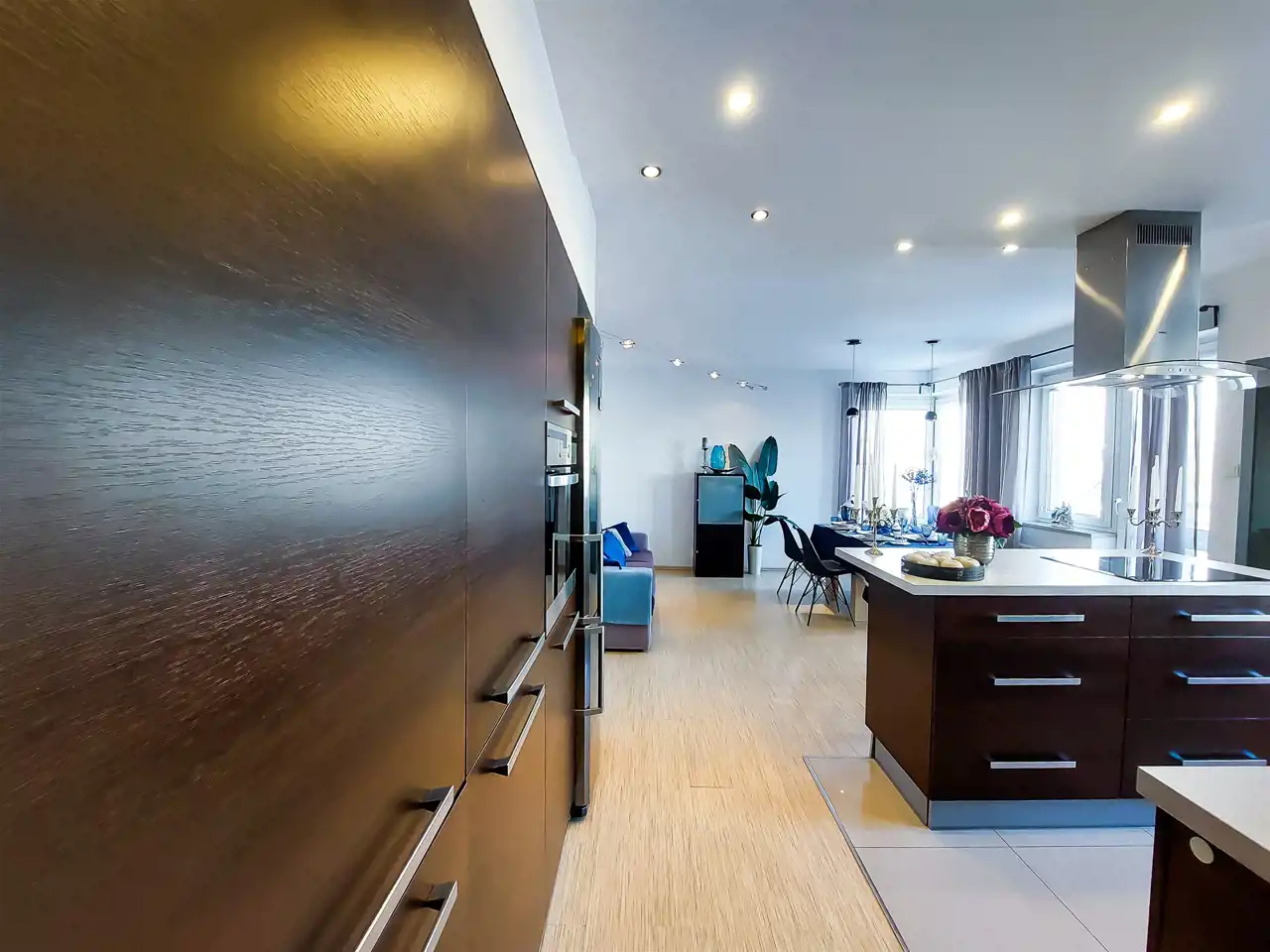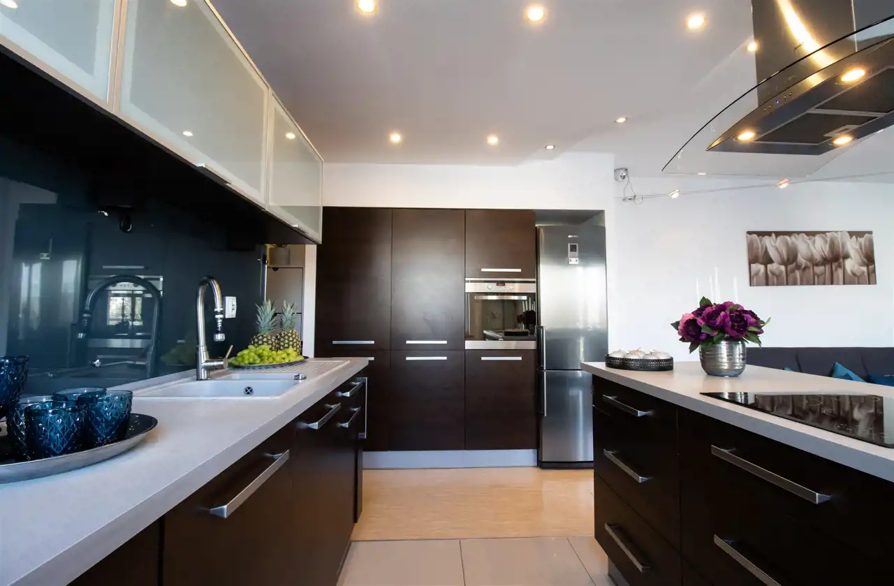 Kuchnia: zabudowa kuchenna wraz ze sprzętami AGD: (okap, lodówka, płyta indukcyjna, zmywarka, piekarnik, zlewozmywak).