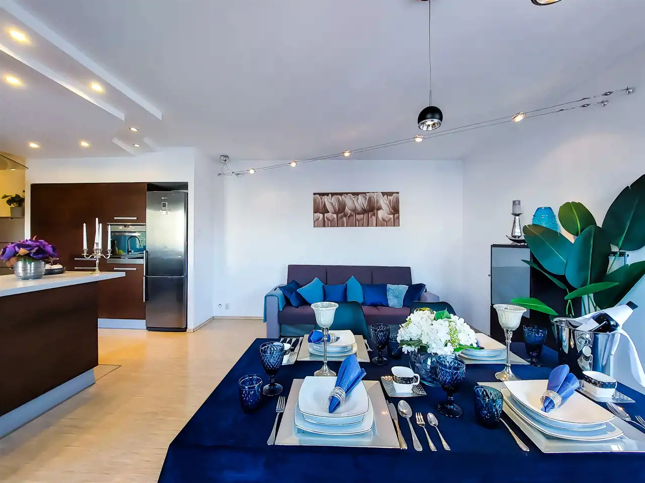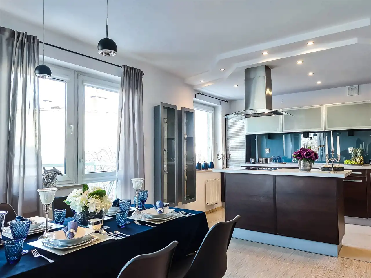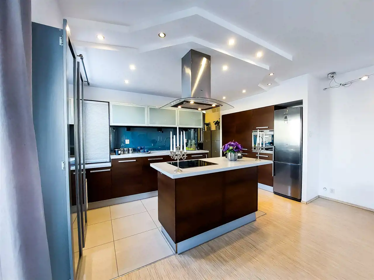 Kuchnia: zabudowa kuchenna wraz ze sprzętami AGD: (okap, lodówka, płyta indukcyjna, zmywarka, piekarnik, zlewozmywak).