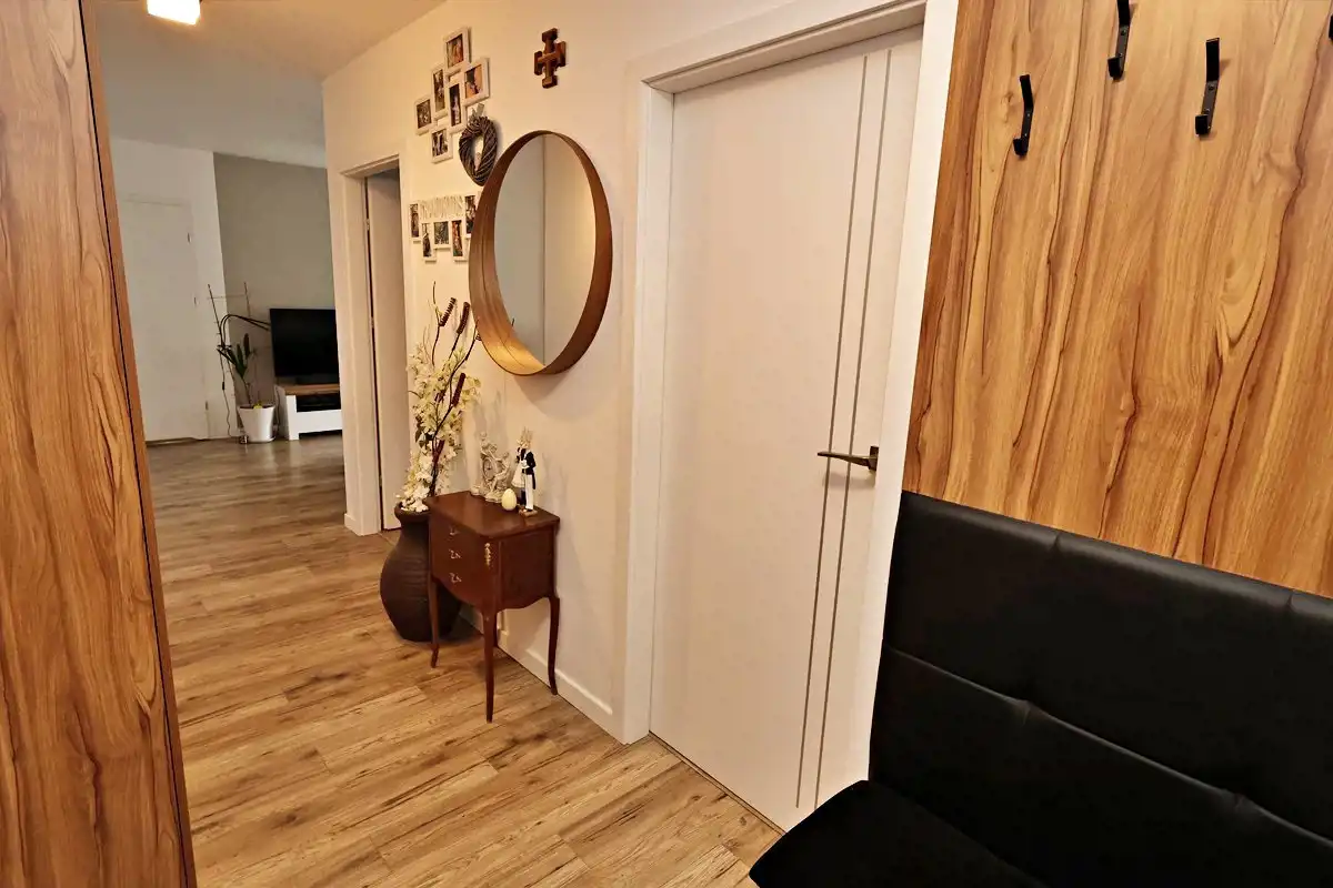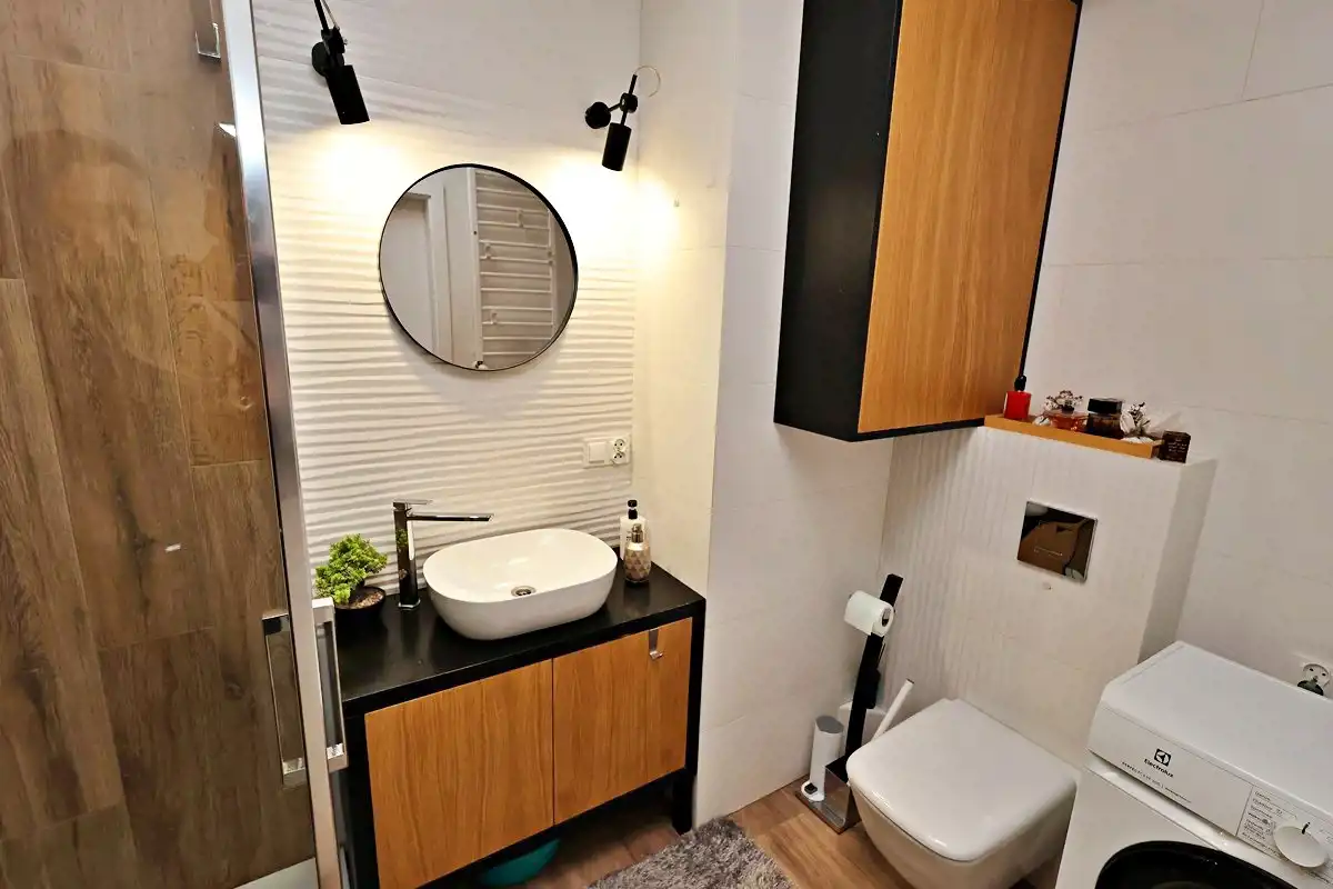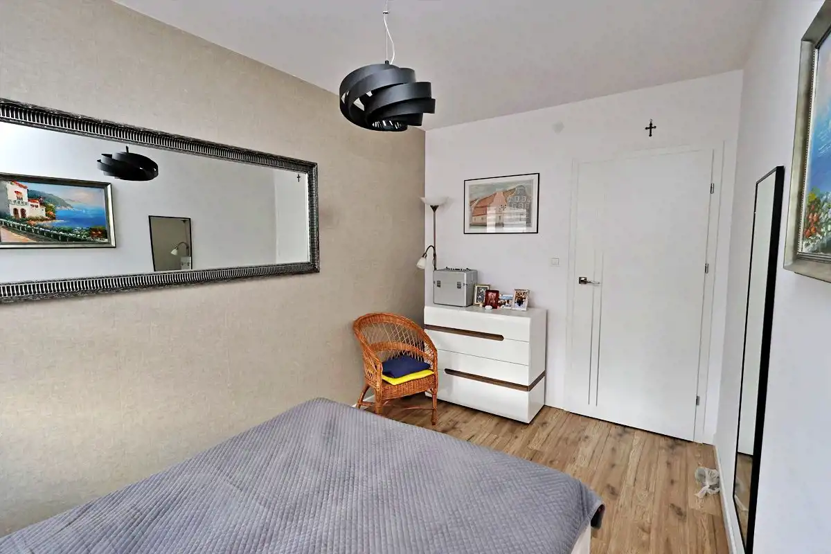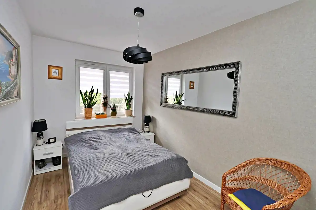 Pokoje sypialniane jasne i ustawne . Drzwi wewnętrzne idealnie komponują się w ogólną kolorystykę jasnego wnętrza . Łazienka z natryskiem , umywalka z zabudowaną szafką , podświetlane lustro, miejsce na pralkę, szafki.