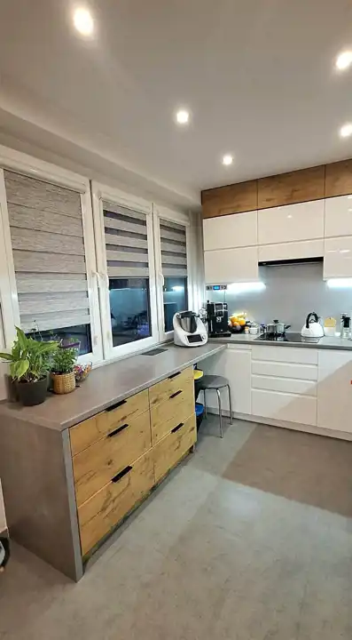 Kuchnia z jadalnią: Jasna, oddzielna kuchnia z oknem, wyposażona w nowoczesną zabudowę meblową. Przemyślany układ pozwolił na wydzielenie wygodnej części jadalnej – idealnej na wspólne posiłki.