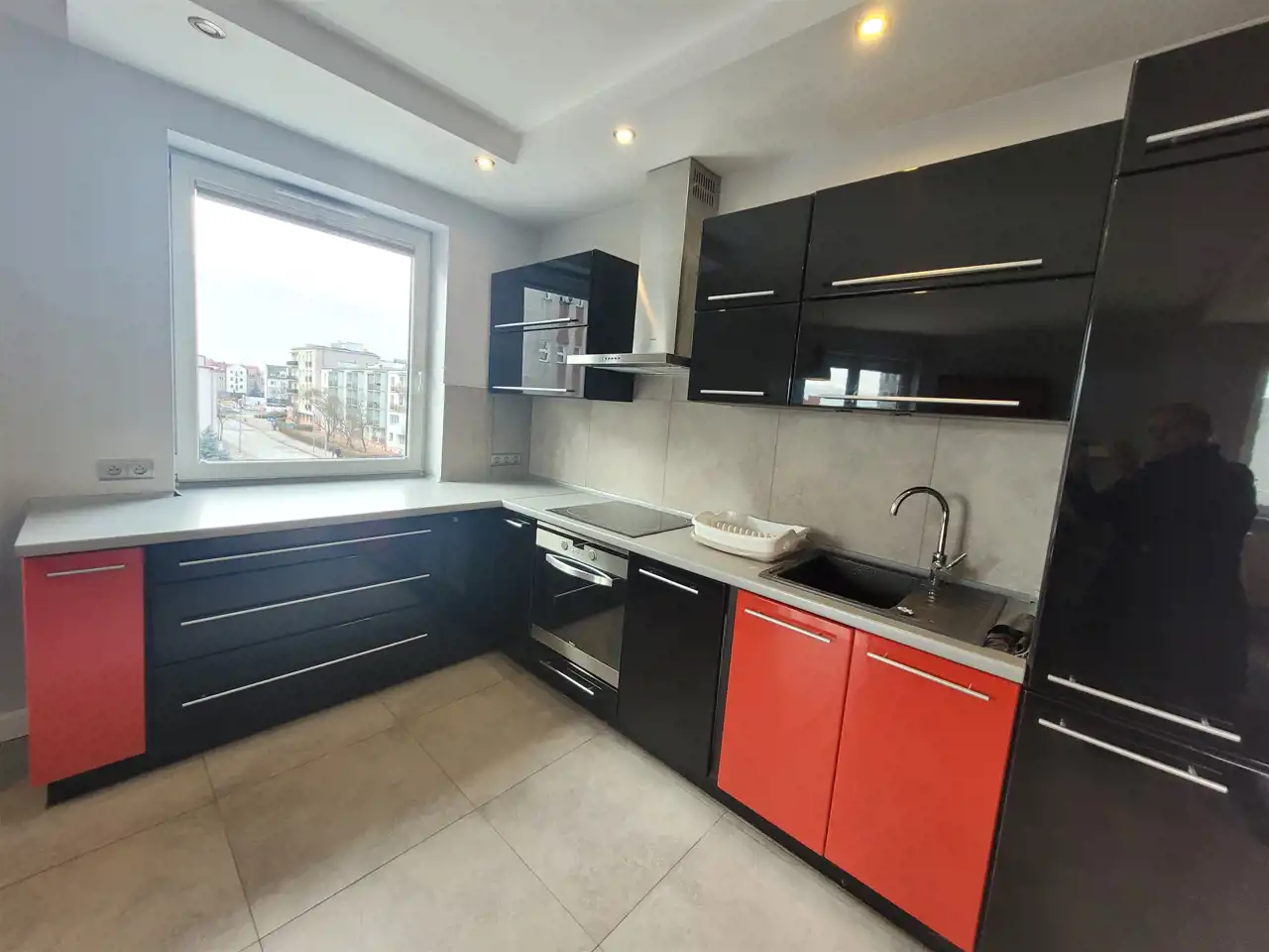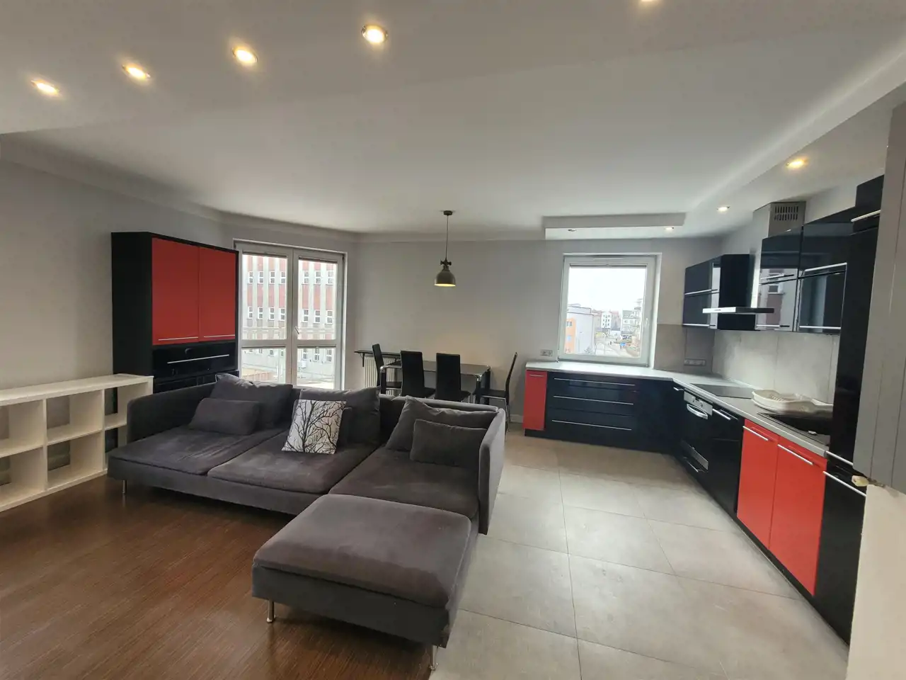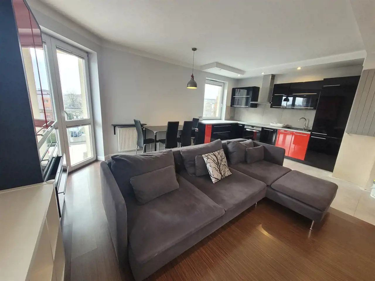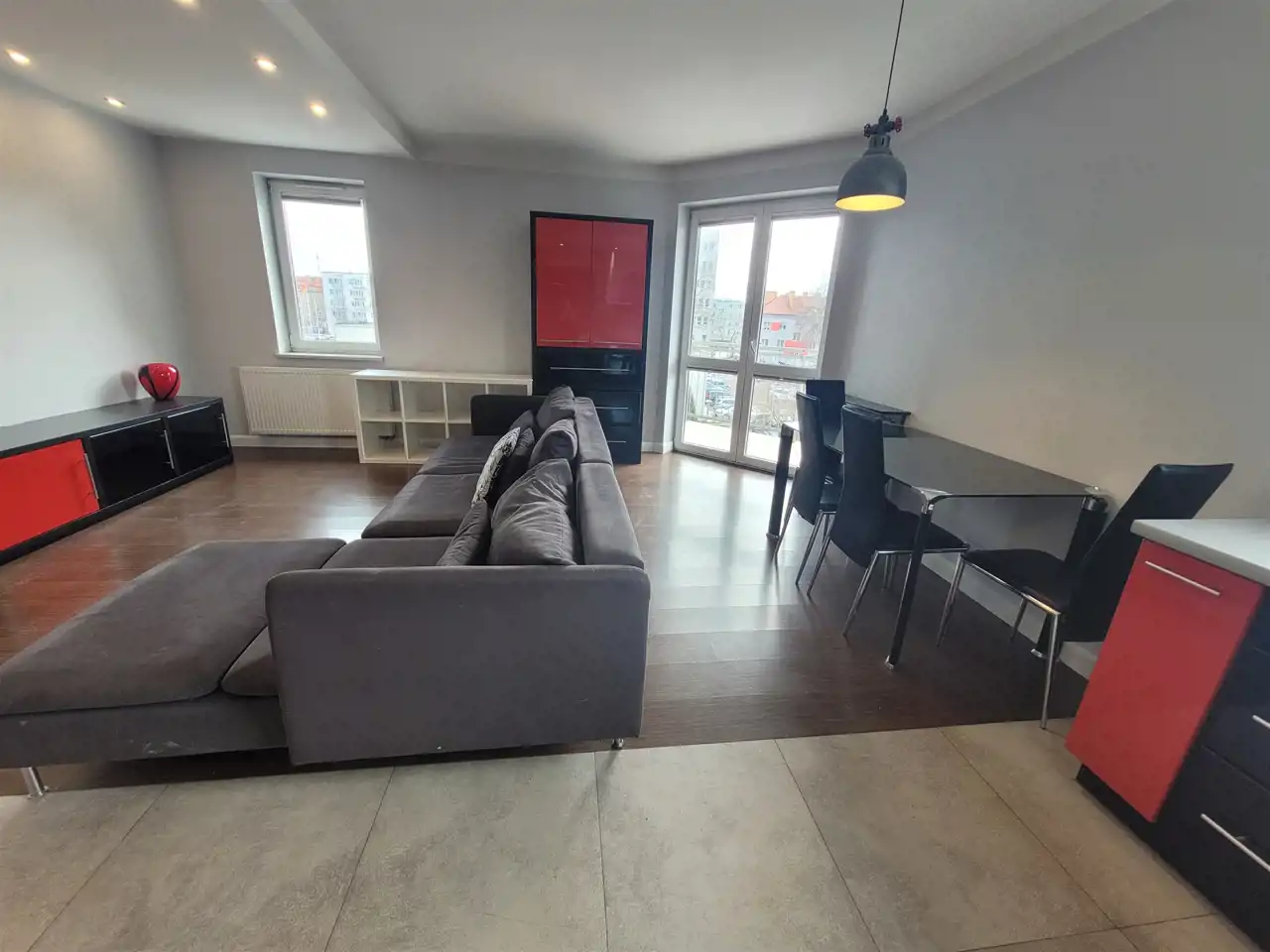 Wyjście na duży narożny balkon z salonu, na drugi z sypialni.